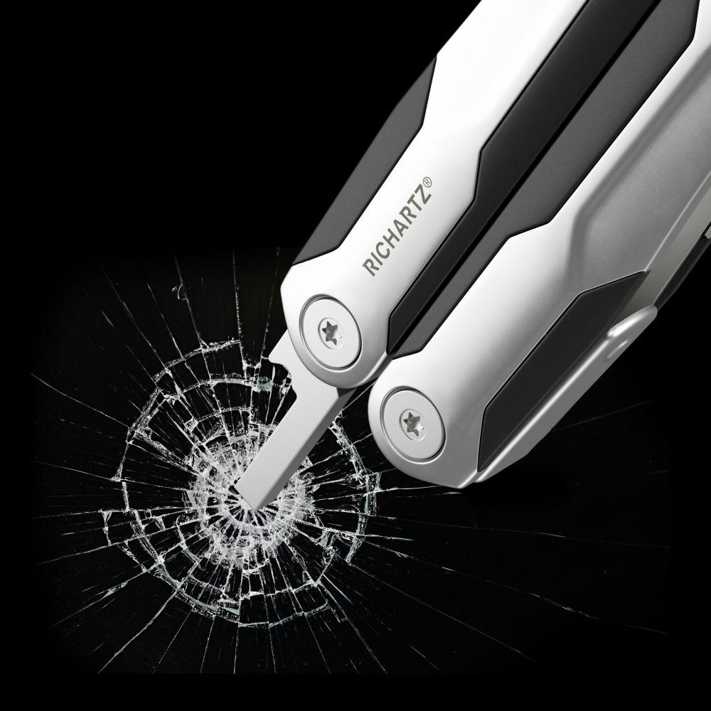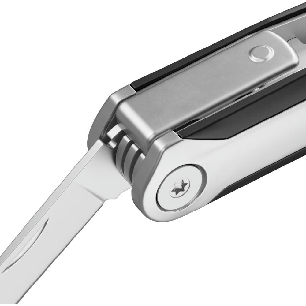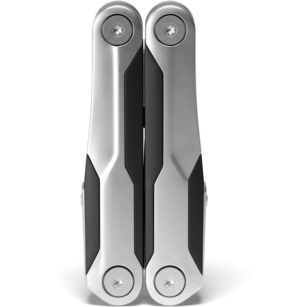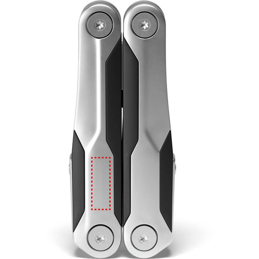 Edelstahlgriffe matt gestrahlt im Materialmix mit Kunststoff-Griffzonen. Funktionen: Gegossene Zange, Drahtschneider, Glasbrecher, Bit-Satz mit 9 Bits, große Klinge, Säge, Feile, Kapselheber, Kreuzschlitzschraubendreher, Schlitzschraubendreher, großer Schlitzschraubendreher, Sechskantschlüssel, Fahrradspeichenschlüssel (2), Kabelabzieher, Nagelzieher, Zentimetermaß, Inchmaß.