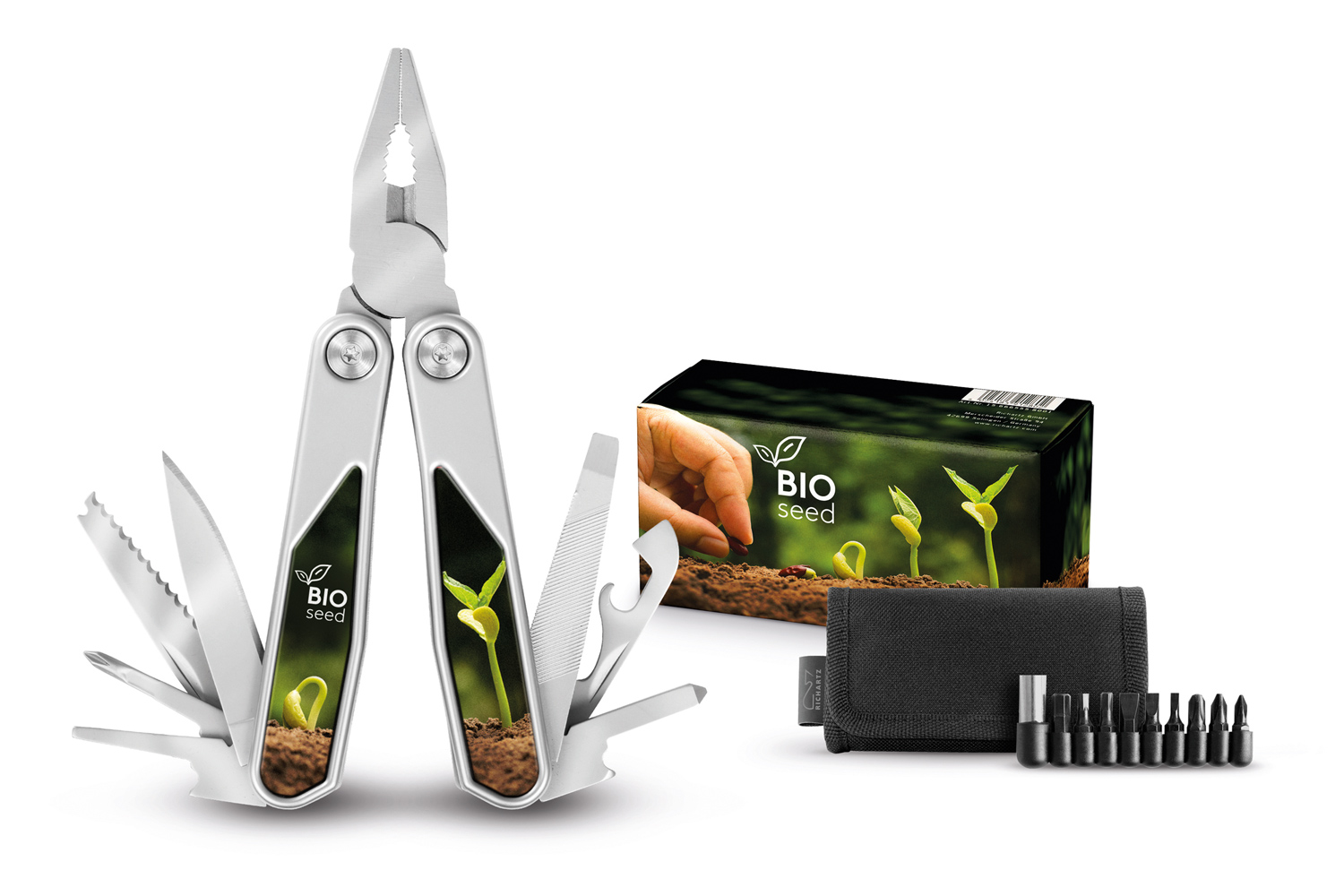 Das Multitool überzeugt durch hohe Präzision und professionelle Funktionen Jede Funktion ist einfach und präzise zu verriegeln und per Knopfdruck zu lösen. Funktionen: 1. Gegossene Zange, 2. DrahtSCHNEIDER, 3. Feile / Schlitzschraubendreher, 4. Dosenöffner / Kapselheber, 5. Schlitzschraubendreher, 6. Kreuzschlitzschraubendreher, 7. Säge, 8. große Klinge, 9. Glasbrecher, 10. Bit-Satz mit 9 Bits.
