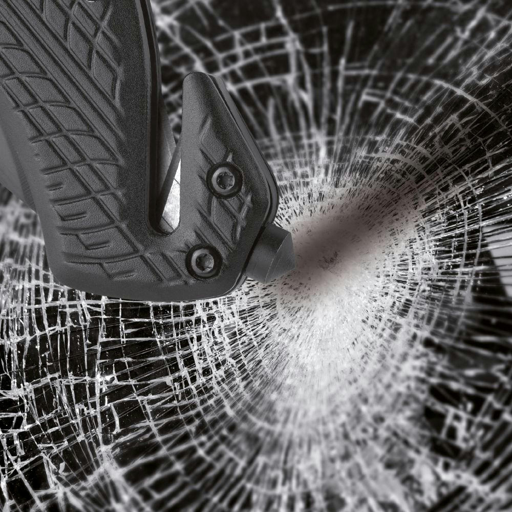Das schwarz beschichtete Tool mit kräftiger, rostfreier Klinge und Safety-Lock Klingenverriegelung gibt Sicherheit im täglichen Gebrauch. Der GurtSCHNEIDER mit doppelter Klingenführung garantiert den schnellen Schnitt. Der speziell gehärtete Werkzeugstahl des Glasbrechers ermöglicht das präzise Zerschlagen der Glasscheibe. Mit geprägter Reifenstruktur auf dem Griff und schwarz beschichteter Klinge.