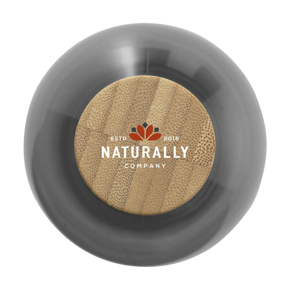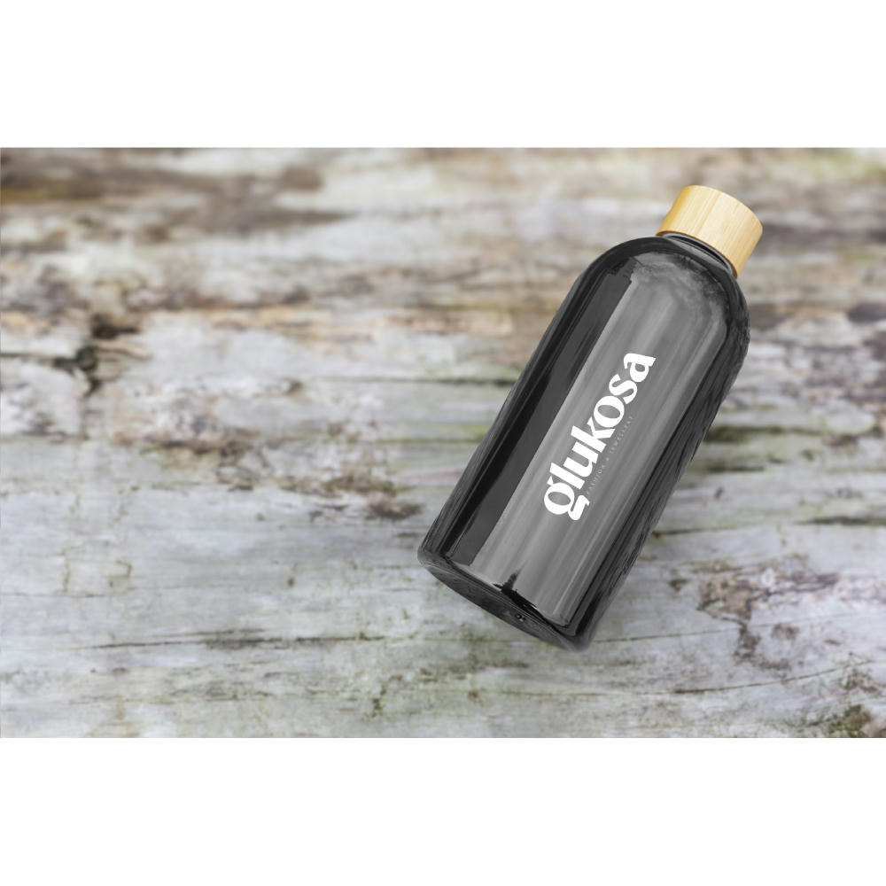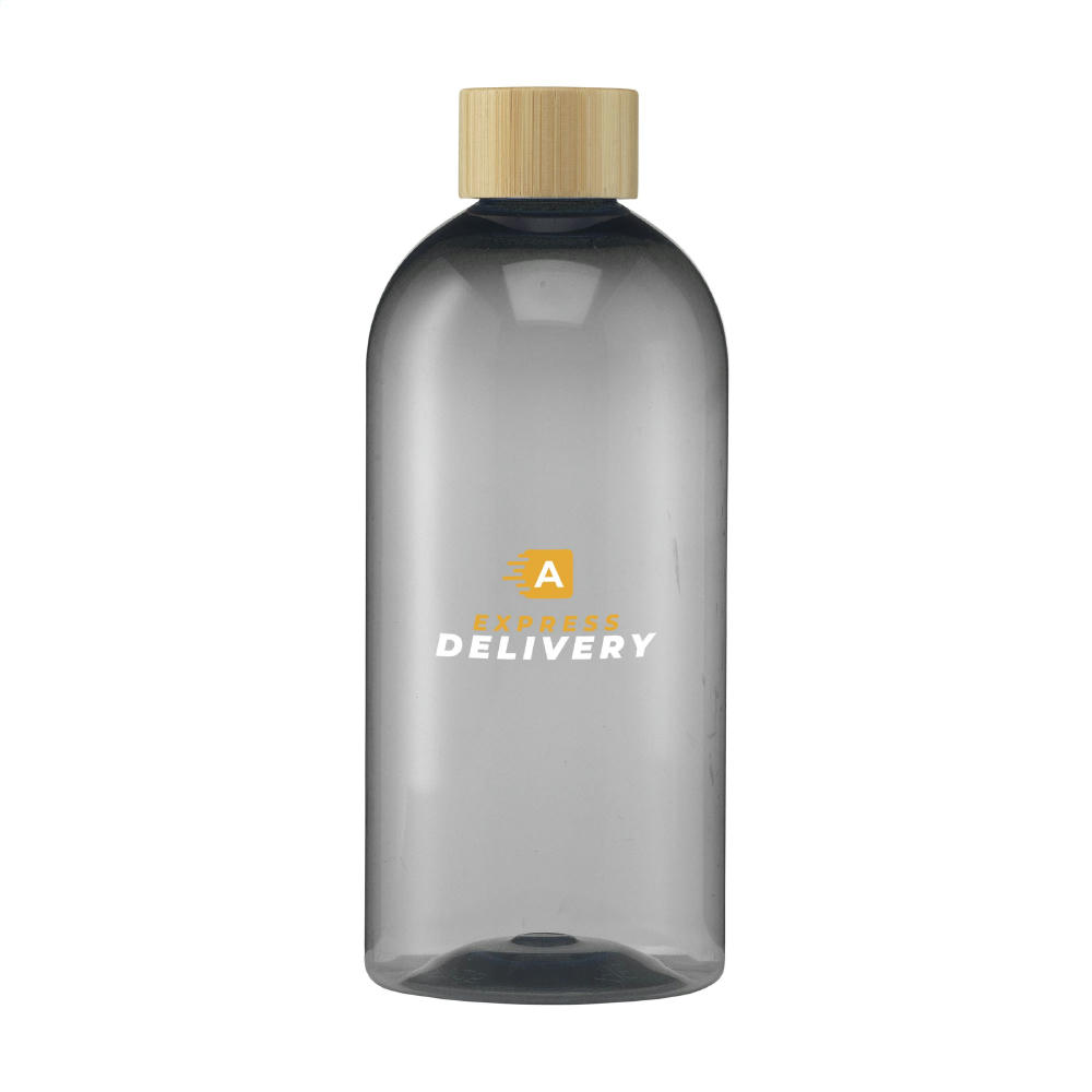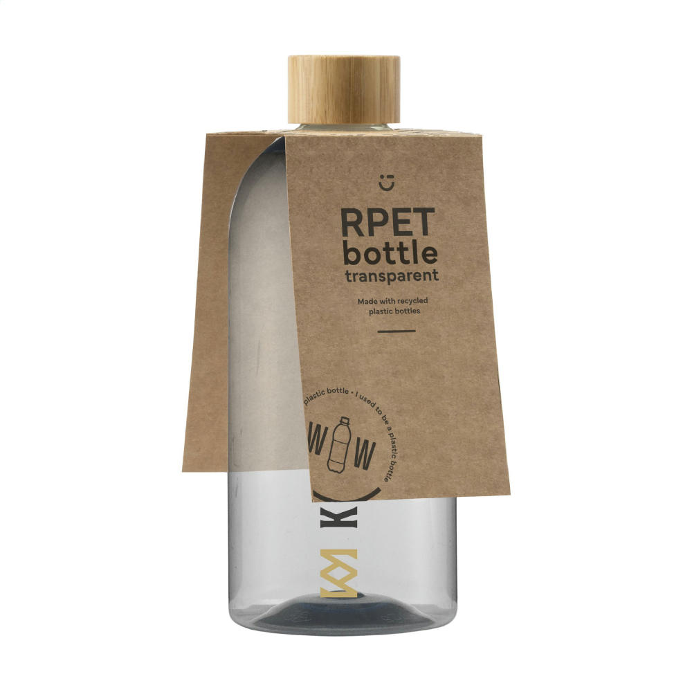 Trinkflasche aus 100% RPET. Mit Schraubverschluss aus Bambus. Auslaufsicher. Nicht spülmaschinengeeignet. Fassungsvermögen 500 ml. Hergestellt in Europa. Optional: Einzeln in einem Kraftkarton und/oder mit einem Etikett aus Kraftpapier geliefert.