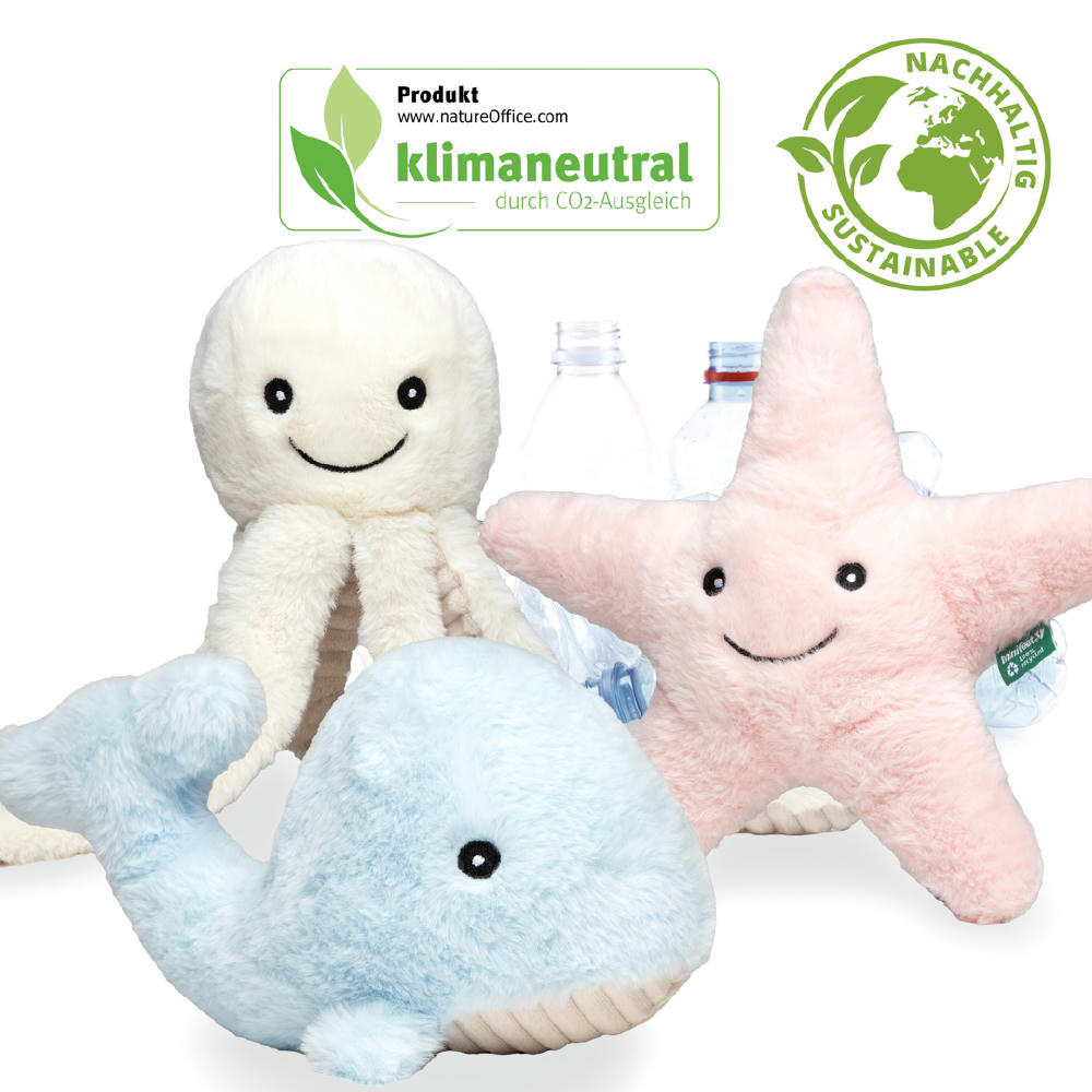 Studien haben gezeigt, dass Kuscheltiere in Form eines Oktopus ideal für den Start von Früh- und Neugeborenen sind, weil die Tentakel an die Nabelschnur erinnern. Liebevoll designt und entwickelt leisten die Recycel-Tieren außerdem einen wichtigen Beitrag zum Thema Nachhaltigkeit: Alle Recycle-Tiere bestehen aus genutzten und recycelten Plastikflaschen. Augen und Nase sind gestickt, es werden also keine zusätzlichen Plastikteile verwendet. Diese liebevoll gestalteten Schätze des Meeres aus zartem Plüsch eignen sich perfekt zum Schmusen, Kuscheln und Liebhaben. Versicherungen, Banken, Krankenhäuser, Kinderärzte und Kommunen können mit diesen Lieblingen im Willkommenspaket für den neuen Erdenbürger nicht nur ein Lächeln schenken, sondern auch Verbindungen fürs Leben schaffen. Eine Veredelung ist via Druck oder per eigenem Plott auf der angebrachten Werbefahne möglich und erinnert so stets an den Schenker.