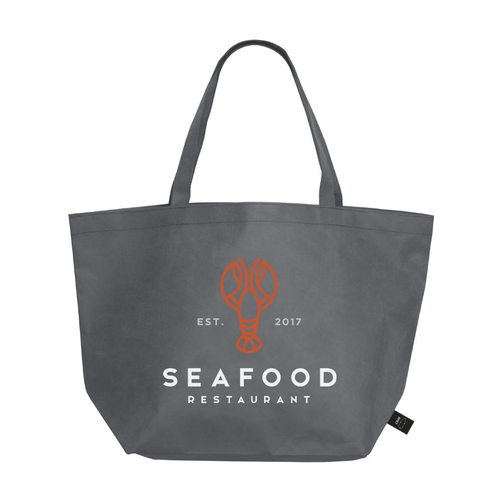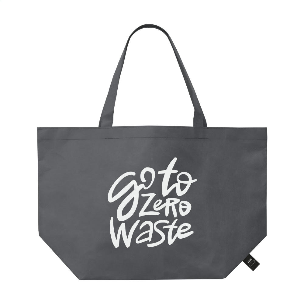 Großzügige RPET-Vlies-Einkaufs- und Strandtasche (80 g/m²), hergestellt aus recycelten PET-Flaschen. Eine breite Tasche, sowohl stark als auch leicht, mit langen Griffen. GRS-zertifiziert. Recyceltes Material insgesamt: 98%. Fassungsvermögen ca. 25 Liter.
