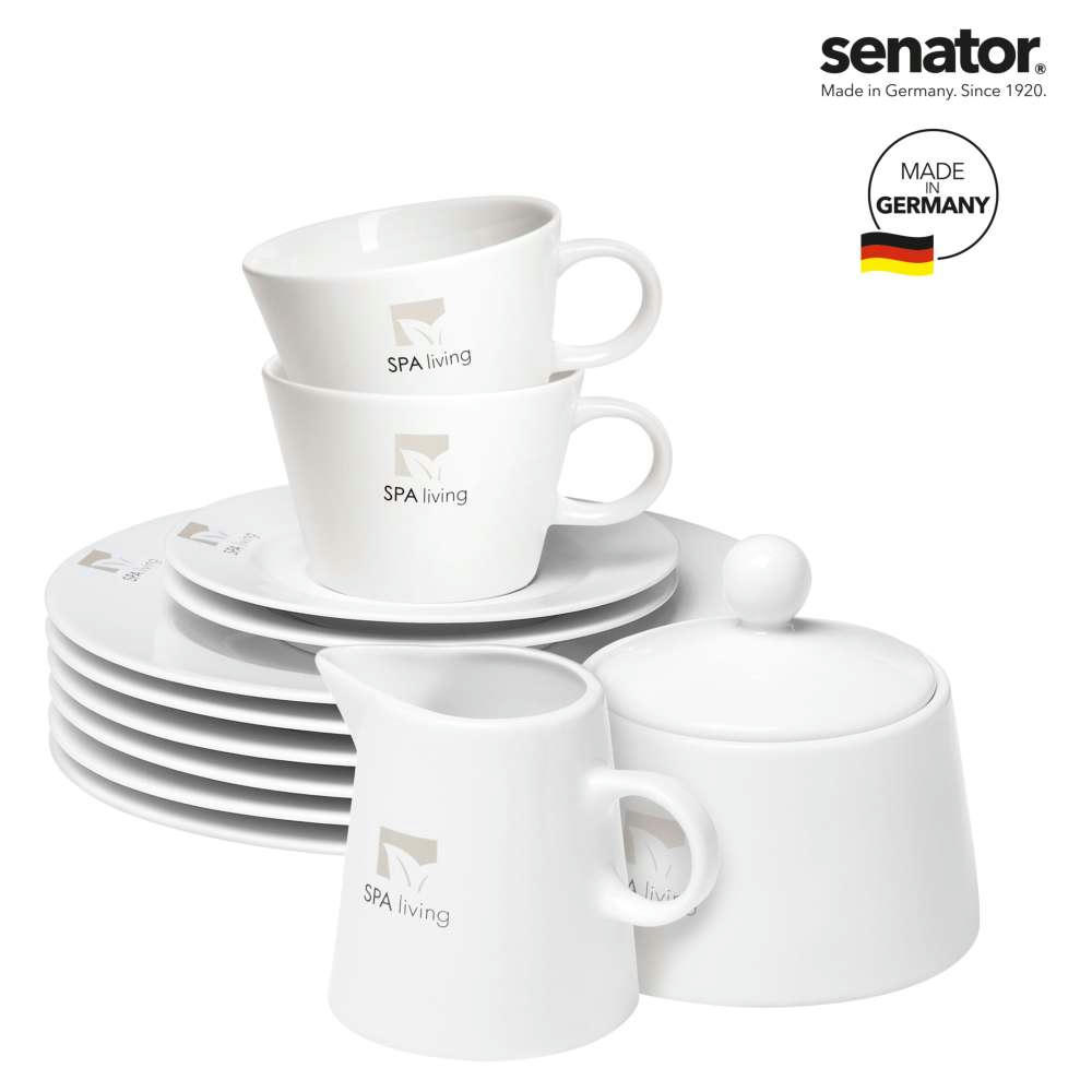 74-teiliges Porzellan-Set, hochglänzend weiß, bestehend aus 24 Tassen mit Untertassen, 24 Desserttellern, 1 Milchkännchen und 1 Zuckerdose.