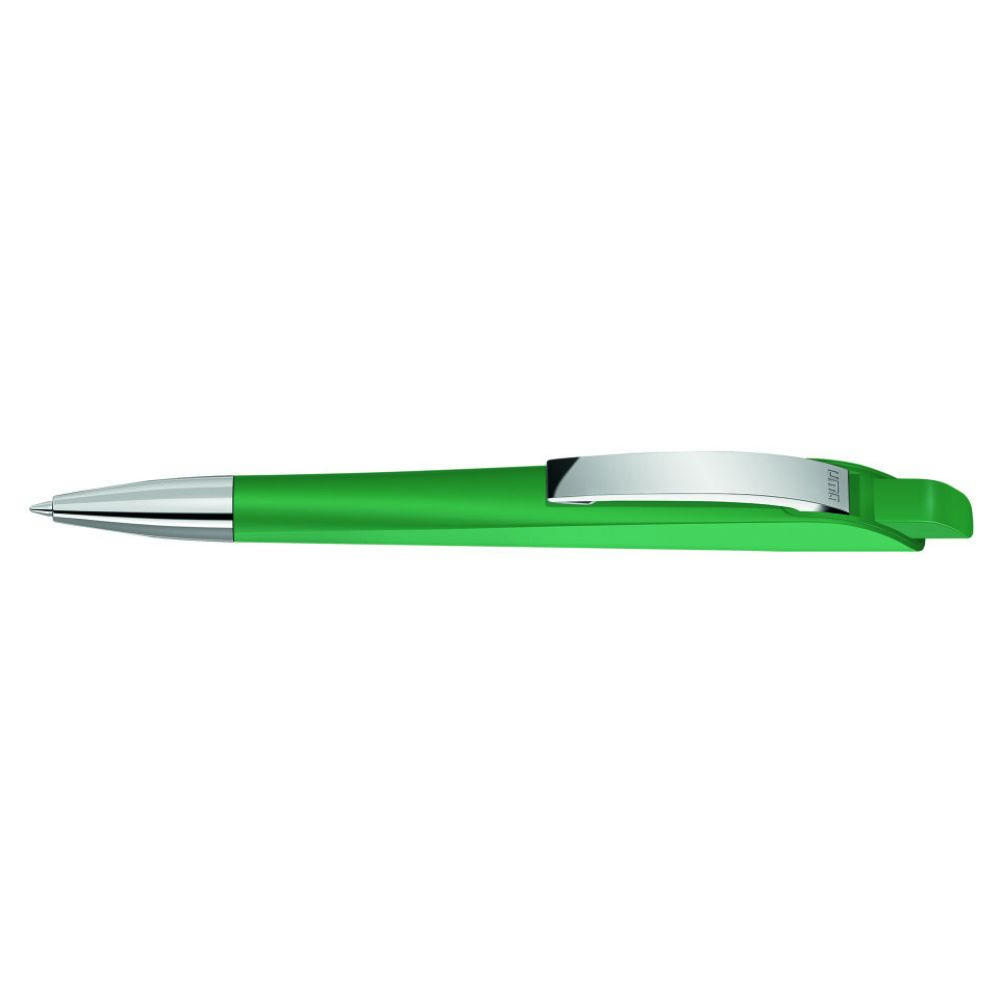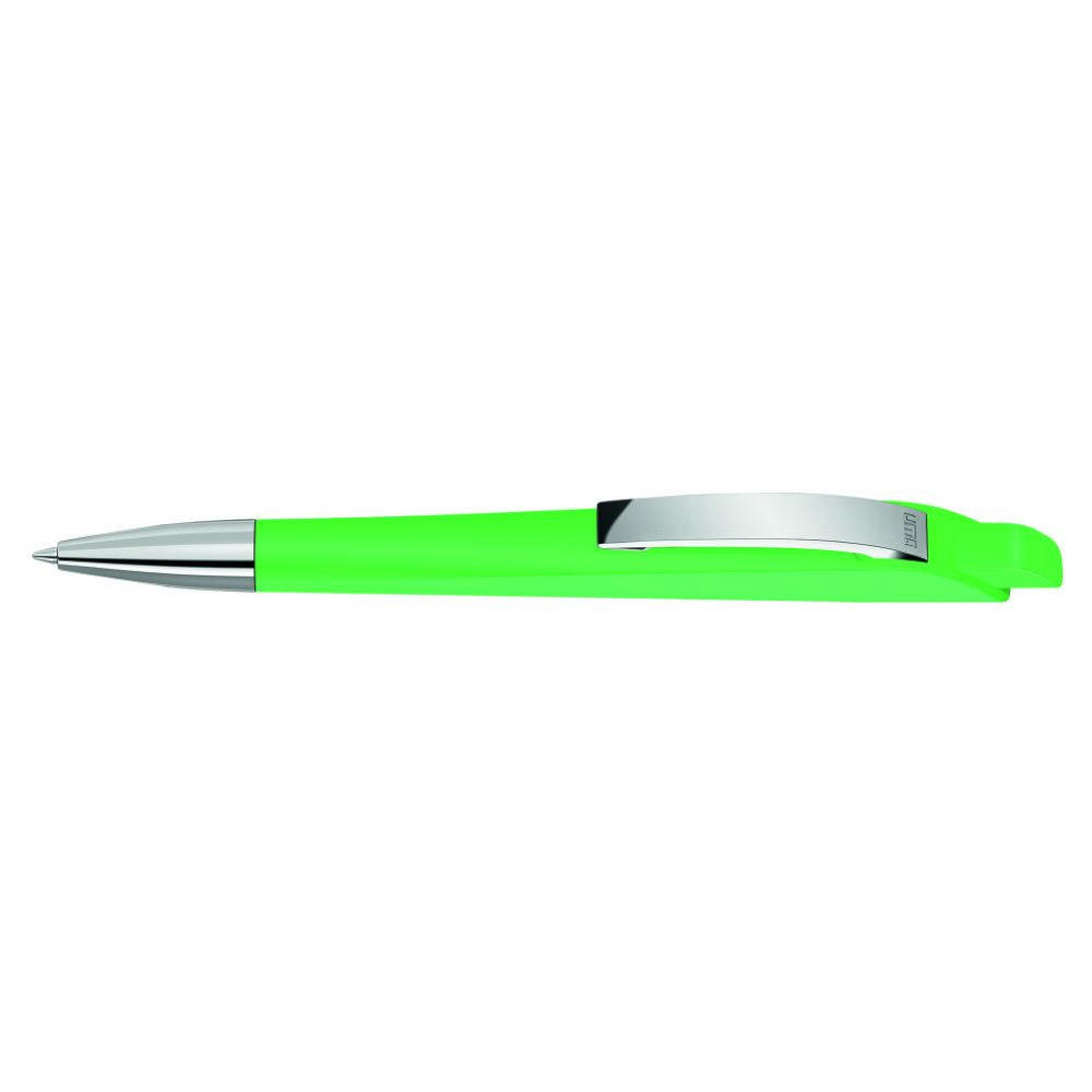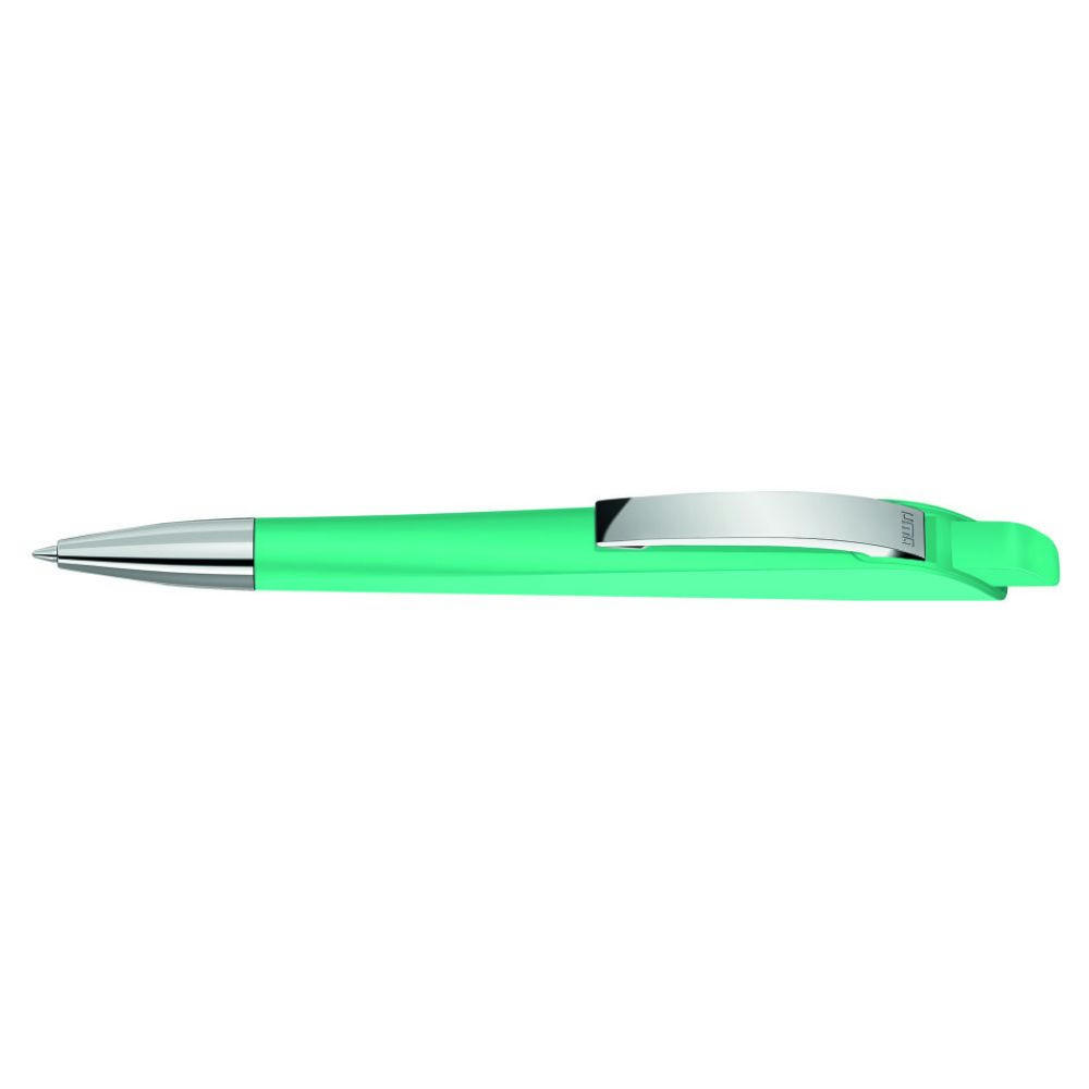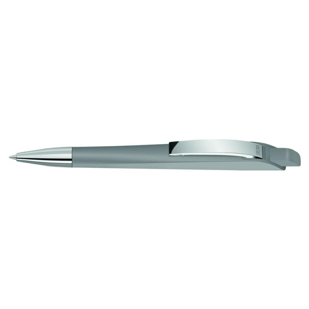 Druckkugelschreiber mit geometrisch wechselnder Schaftform. Gehäuse und Drücker gedeckt matt, Metallclip und Metallspitze glanzverchromt.