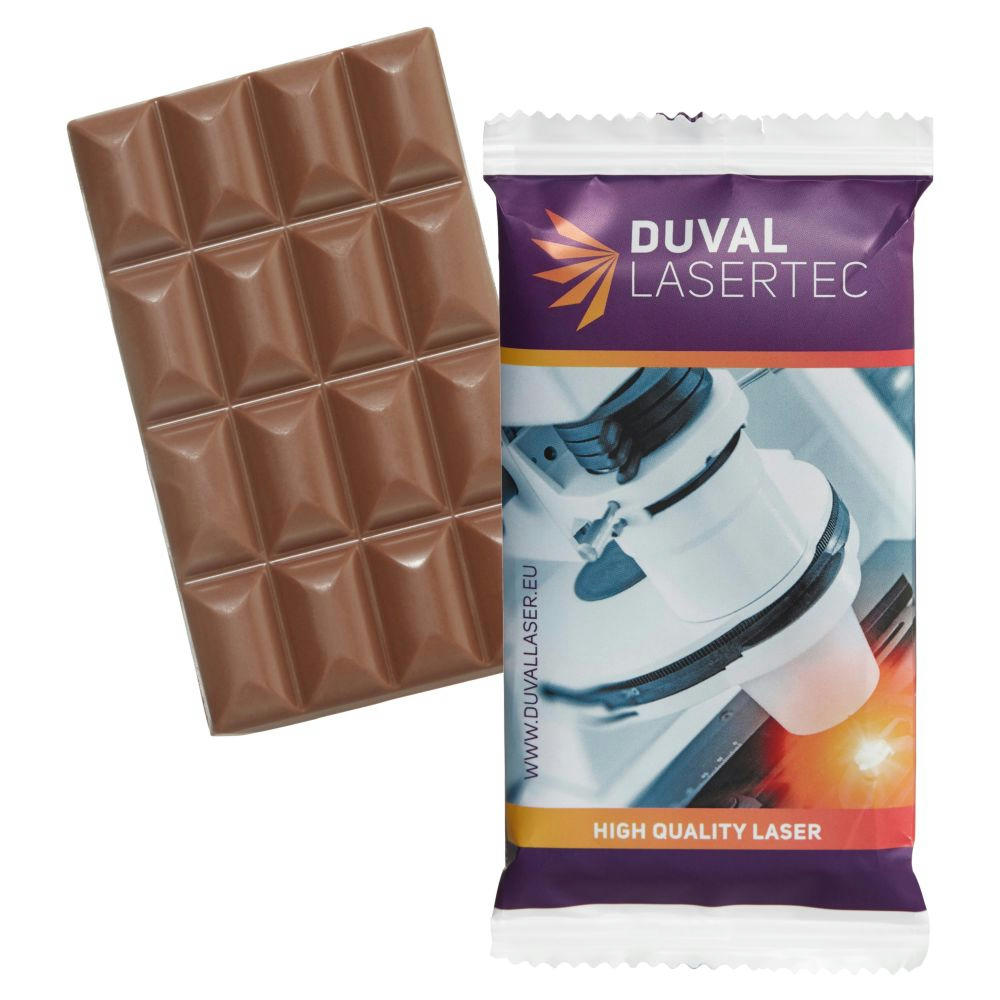 Einzeln in glänzend- oder matt-kaschiertem weißem, transparentem oder alubedampften Flowpack verpackt. Vollmilchschokolade mit mindestens 30 % Kakao. Maße: ca. 13,3 x 6,5 x 1 cm. Inhalt: 40 g. Haltbarkeit: ca. 6 Monate. Preis inkl. 1–5c-Druck