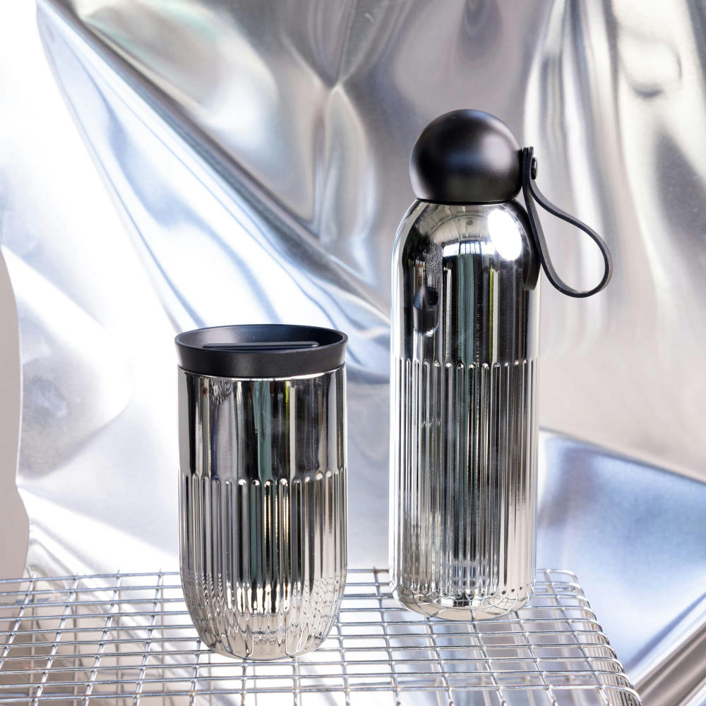 Diese verchromte Sagaform Tekla-Variante aus recyceltem, verzinktem Stahl hat Vakuumisolierung und Kupferbeschichtung. Hält Getränke 12 Std. heiß oder 24 Std. kalt ohne Kondensation. Vertikale Streifen, abgerundeter Deckel aus recyceltem Kunststoff, abnehmbarer Strohhalm. Spülmaschinenfest.