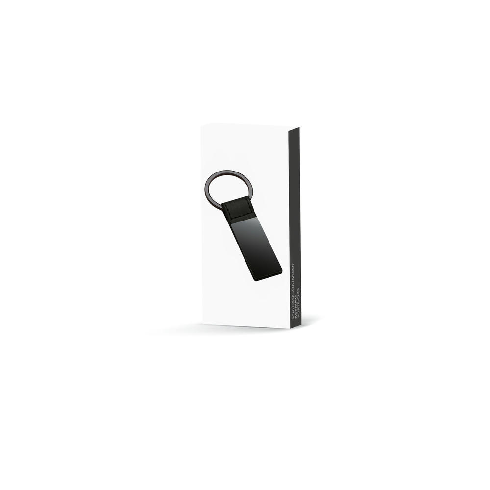 Der Schlüsselanhänger ist aus schwarzem Kunstleder und zeigt eine schwarzglänzende Gunmetal-Plattierung auf dem veredelbaren MeDer Schlüsselanhänger ist aus schwarzem Kunstleder und zeigt eine schwarzglänzende Gunmetal-Plattierung auf dem veredelbaren Metallstück des Anhängers. Die Individualisierungsmethode der Wahl ist eine edle und hochwertige Lasergravur, die den Anhänger zu einem echten Prachtstück werden lässt.