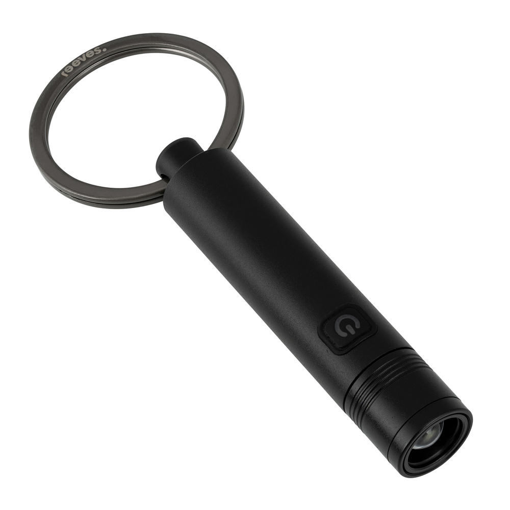 Schlüsselanhänger mit wiederaufladbarer LED-Taschenlampe (80 Lumen) mit USB-C-Anschluss aus schwarz eloxiertem Aluminium . Verstellbare Lichtintensitäten (zoombar auf 50% oder 100% Leuchtkraft). Leuchtdauer: 30 Minuten bei 100% Leuchtkraft; 75 Minuten bei 50% Leuchtkraft. 2,5 Stunden Ladezeit, 120 mAh Akku. Spritwassergeschützt IPX4. Inklusive USB-C-Ladekabel und Geschenkverpackung.