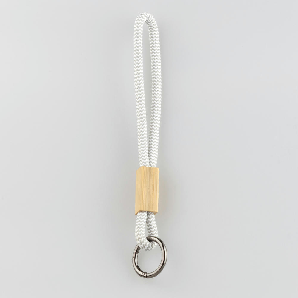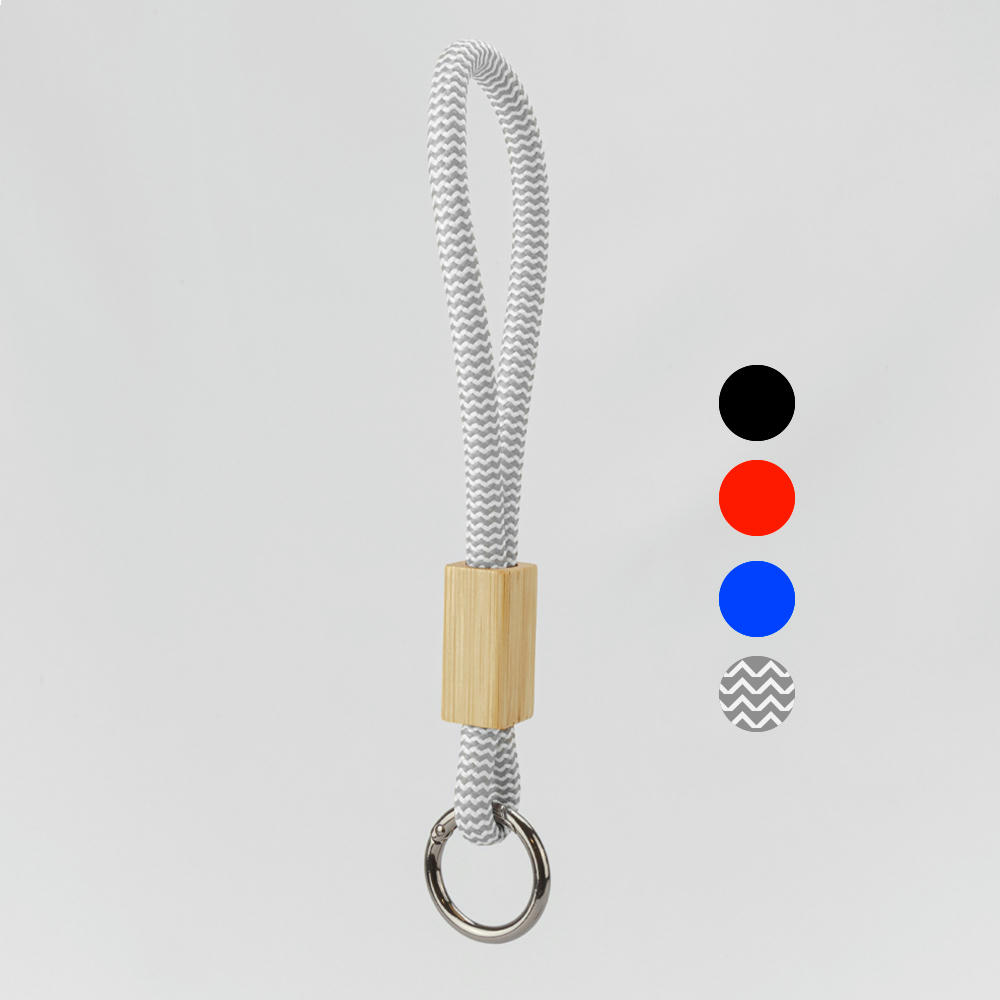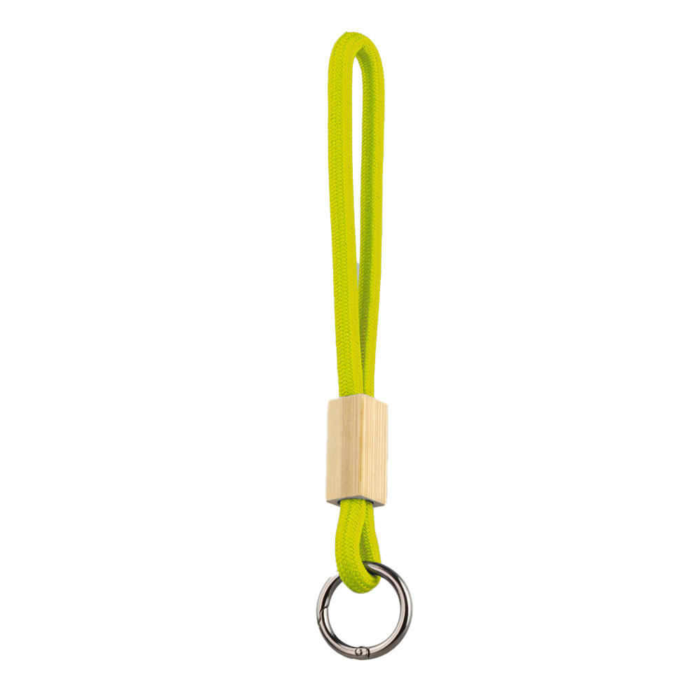 Praktisches Keyband aus recyceltem PET mit Bambus-Slider. Schlüsselring aus Metall, in vier Farben oder individuell nach PANTONE®. Bambus-Slider ideal für Logo-Gravuren.