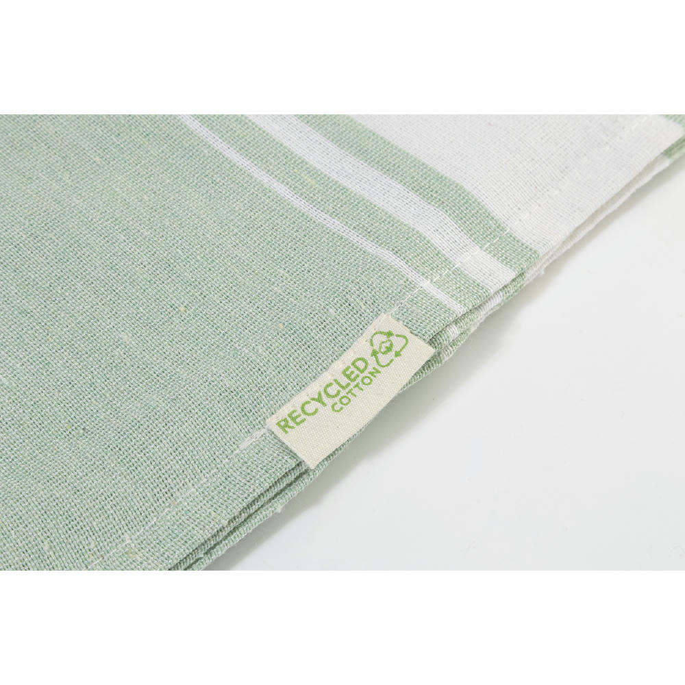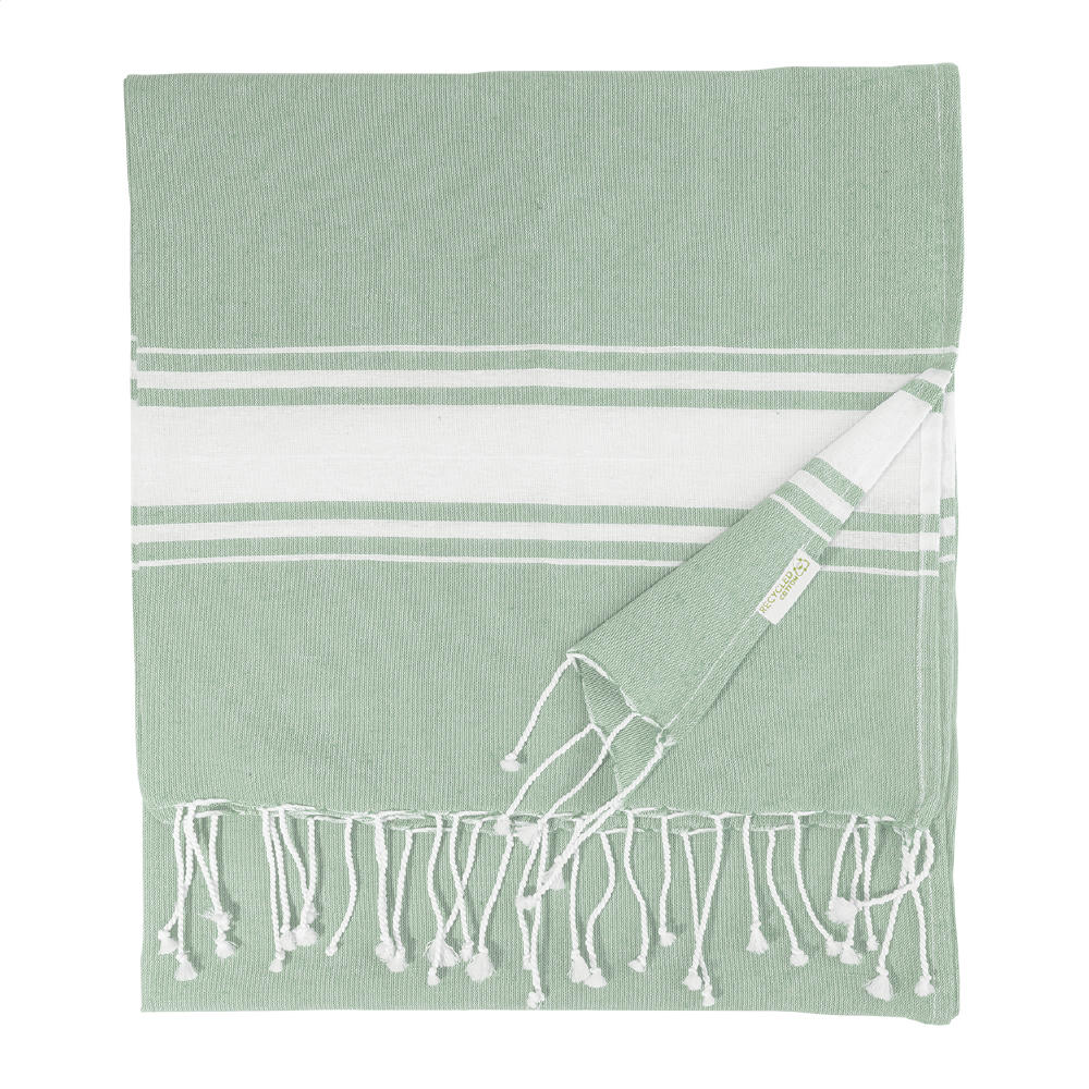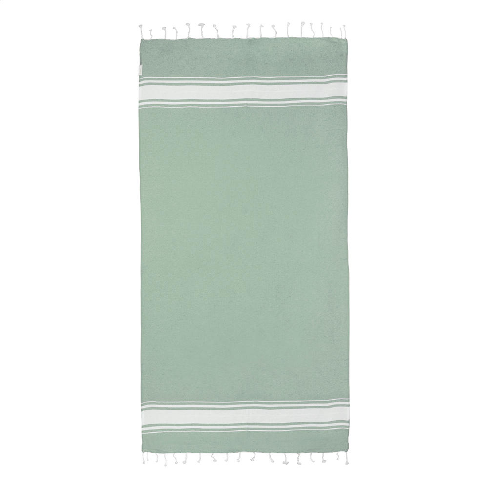 Zweifarbiges Pareo-Strandtuch. Material: 70 % recycelter Baumwolle und 30 % RPET-Polyester (180 g/m²).