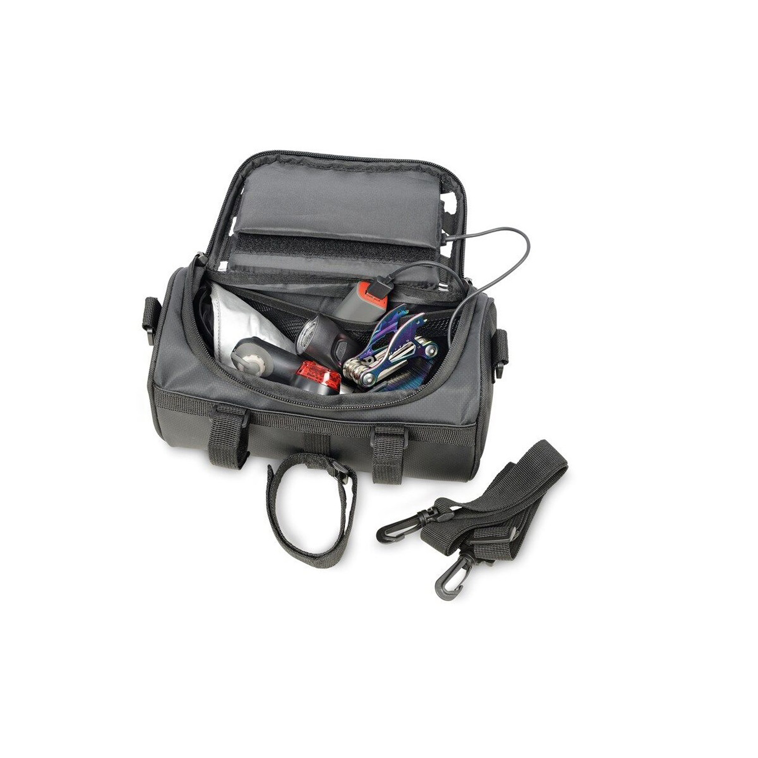 Fahrradtasche für den Lenker, flexible Befestigung mittels 3 Klettverschlussbändern am Lenker, geräumiges Hauptfach mit Reißverschluss, inkl. Netzfach (z.B.: für Powerbank), Touchscreen-Sichtfenster passend für gängige mobile Geräte zur Navigation, seitlich geöffnet zum Hauptfach (Laden via Powerbank), abnehmbarer, verstellbarer Schultergurt, Schlaufe zur Befestigung des Vorderlichts, Kapazität ca. 4 Liter, Tragkraft bis zu 5 kg, schützt Inhalt vor Spritzwasser (Wasserdichtheitsgrad IPX4) , formstabil durch verstärkte Kanten.
