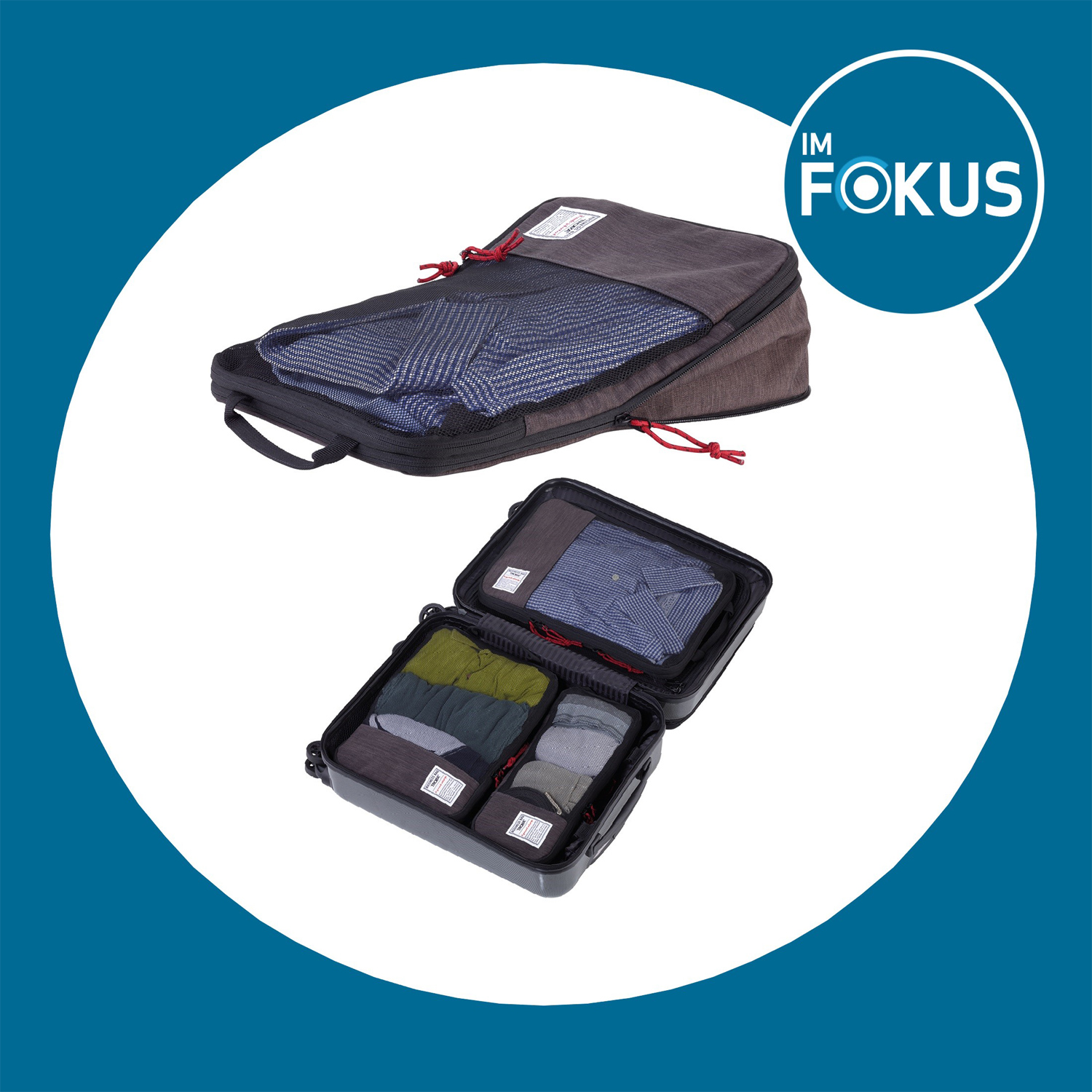 Kompressionstaschen-Set: 3 Packtaschen mit Reißverschluss und zusätzlichem Kompressionsreißverschluss für platzsparendes, geordnetes und knitterfreies Packen von Kleidung in Koffer & Rucksack, 3 Größen: L (Hemden & Hosen), M (Shirts), S (Wäsche & Socken), jeweils mit Netzfenster und Tragegriff. Material: Polyester. Farben: anthrazit, schwarz. Maße: 39 x 27 x 4 x cm, Gewicht: 445 g