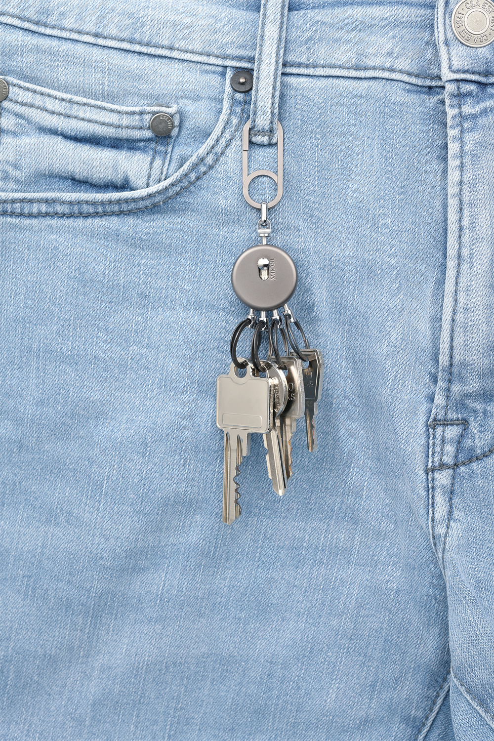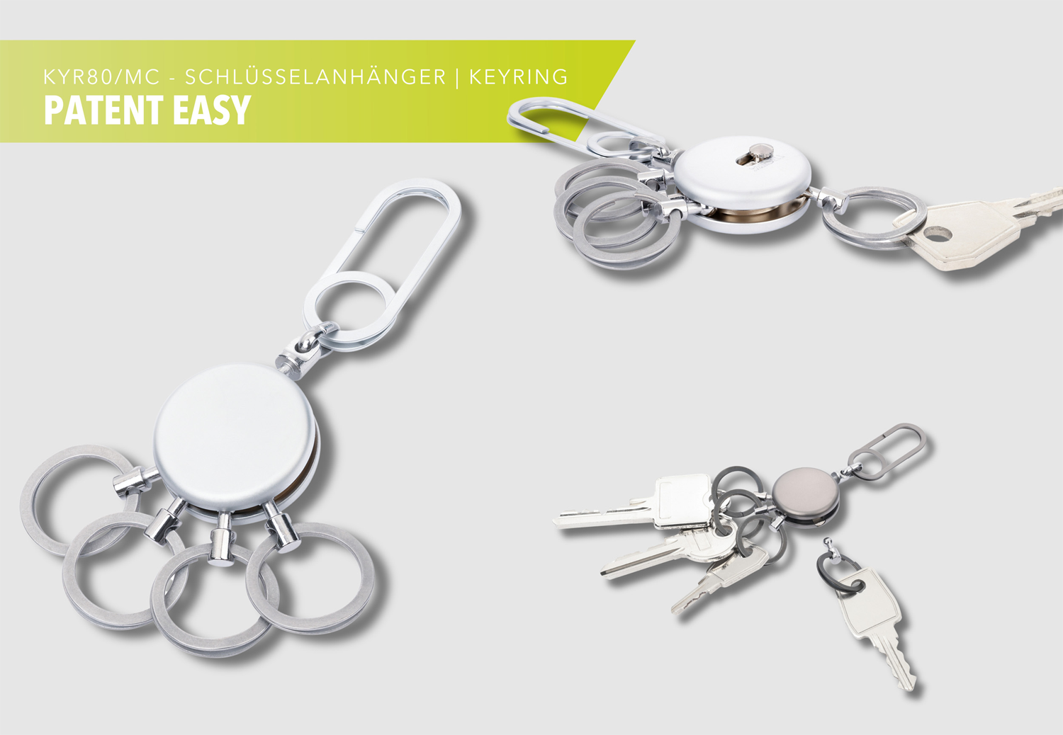 Schlüsselanhänger, rund, inkl. Karabinerhaken, 4 ausklinkbare Ringe, schnelles & einfaches Anbringen der Schlüssel dank patentiertem Öffnungsmechanismus (TROIKA NAIL GUARD), Messing, Metall, verchromt, matt, silberfarben