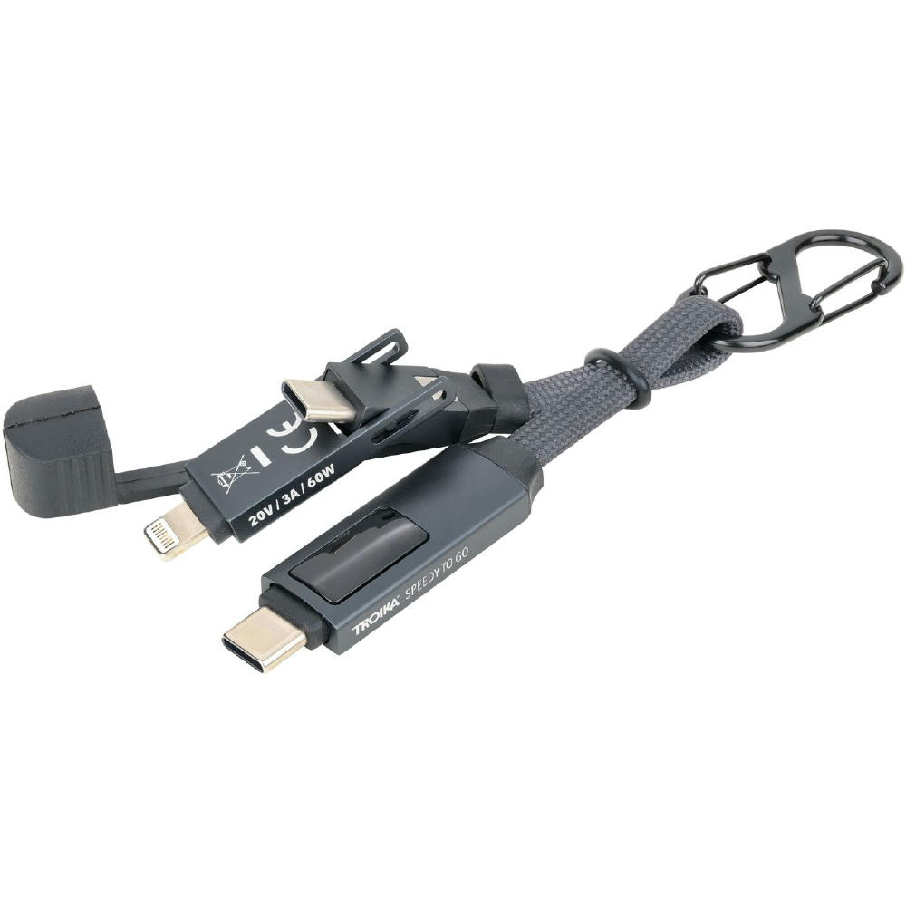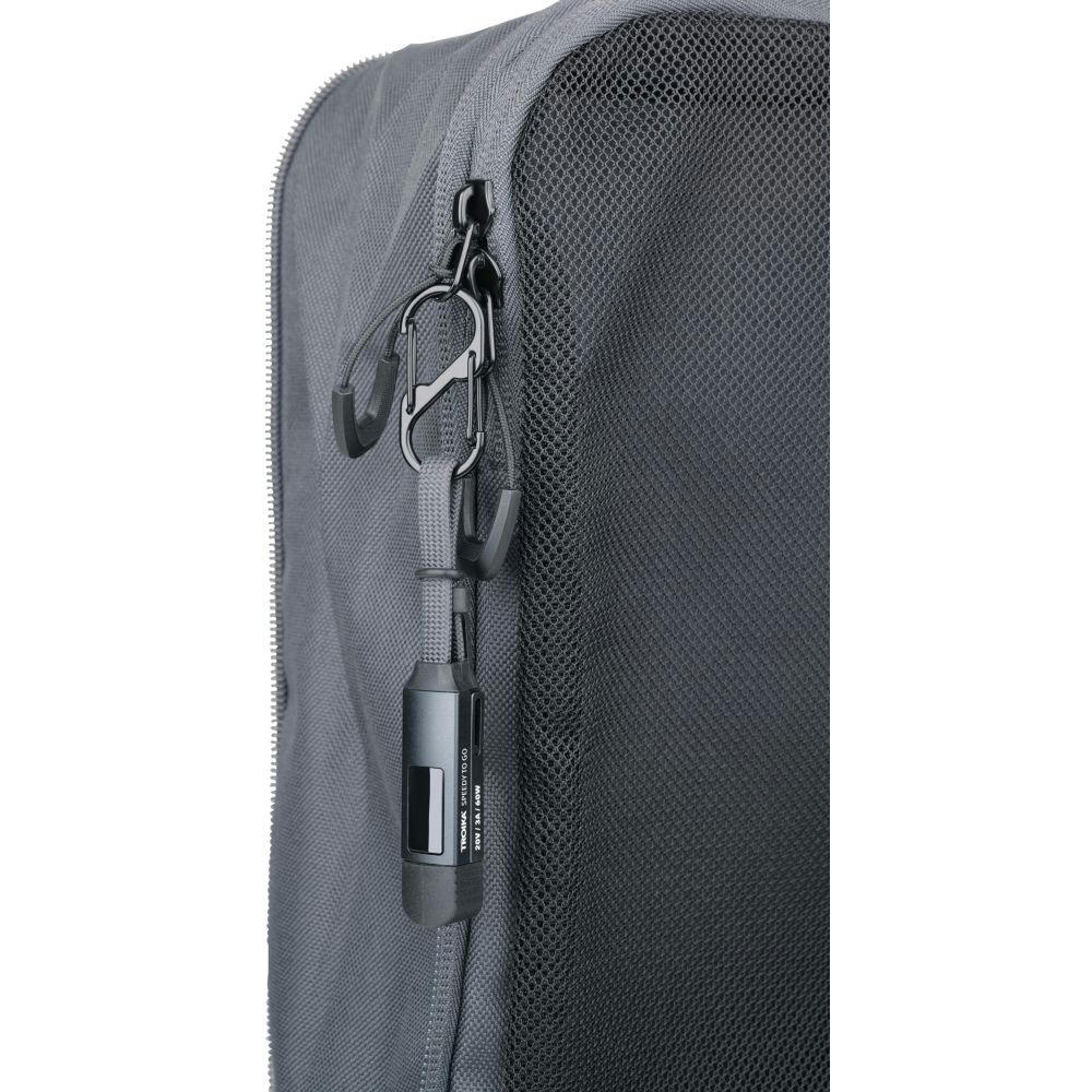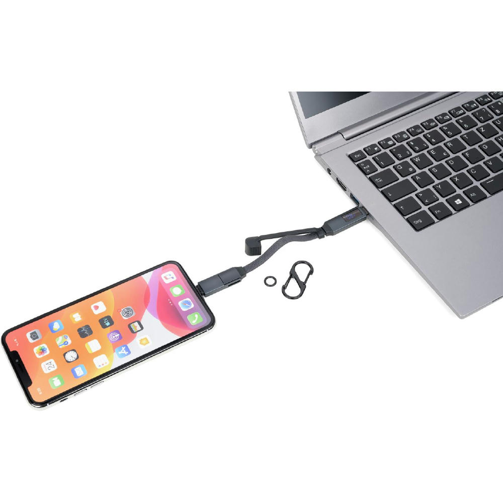 Taschenanhänger mit Ladekabel: High-Speed USB-C 60W PD Power Delivery auf USB-C, mit Datenübertragungsfunktion, volle Ladekapazität: max. 60W|20V|3A (ohne Adapter), abhängig vom zu beladenen Gerät, mit digitaler Anzeige der Ladeleistung, inkl. USB-C auf Lightning Adapter, mit Doppelkarabiner zur Befestigung an Schlüsselbund, (Sport-)Tasche o.Ä., mit Magnetverschluss und Kappe.