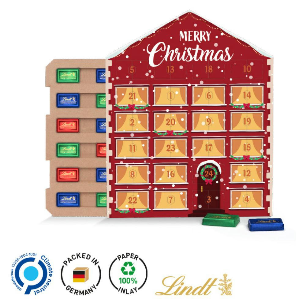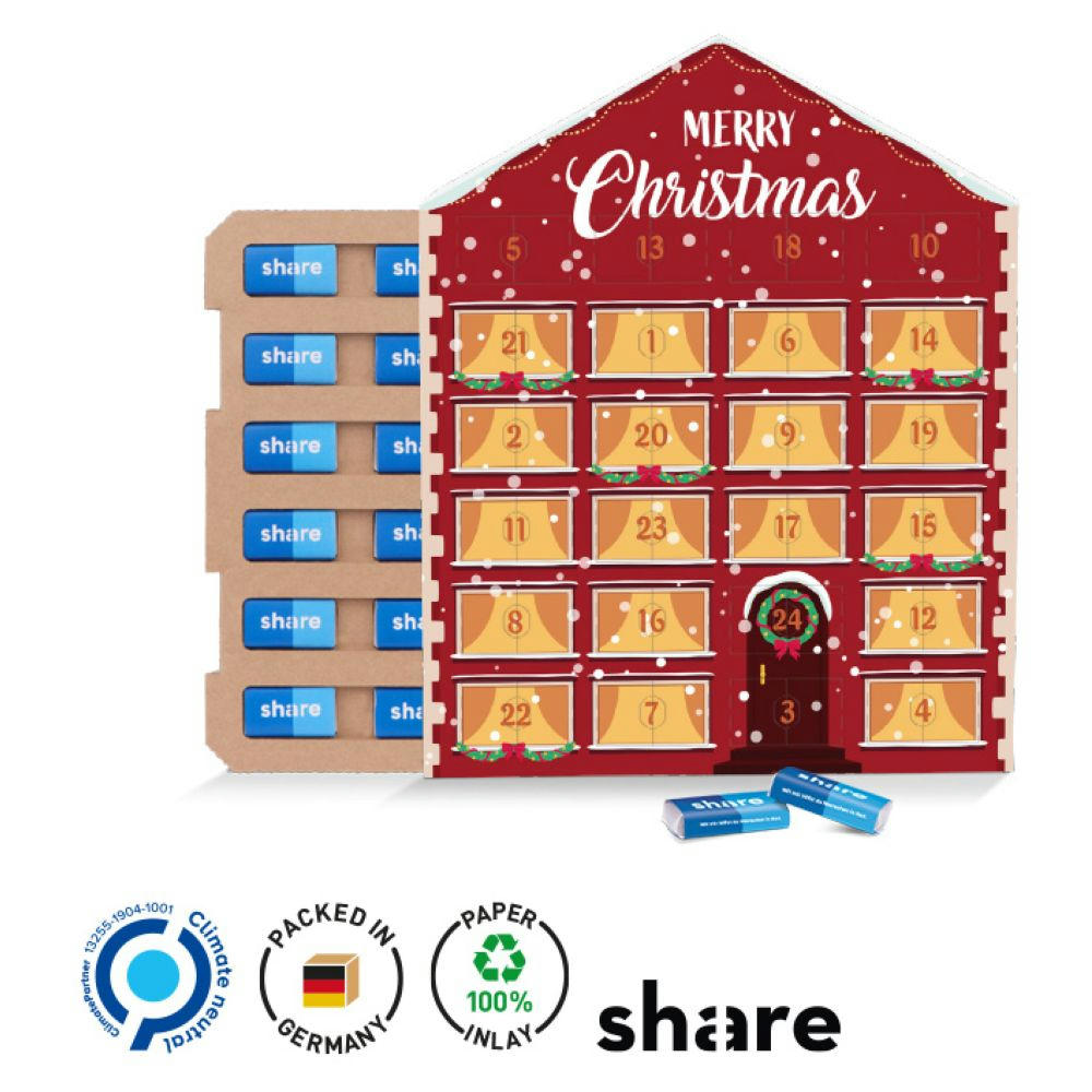 Täfelchen Kalender ECO in Hausform, Inlay aus 100 % Papier, Vollkartonhülle individuell bedruckt. Inhalt: 24 Alpenmilch-Schokotäfelchen mit Fairtrade-Zutaten, eingewickelt in Pergaminpapier (kann über die Papiertonne entsorgt werden), 72 g