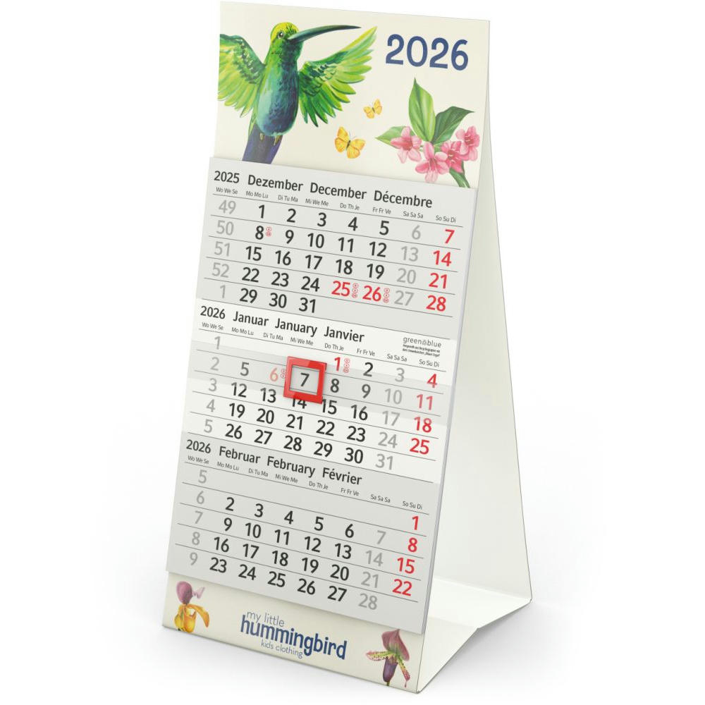 Preiswerter Tisch-Kalender zum Aufstellen mit übersichtlichem 3-Monatskalendarium aus Recyclingpapier (hergestellt aus 100% Altpapier) mit dem Umweltzeichen "Blauer Engel". Kalendarium: Deutsch 3sprachig hellgrau/rot, Kalenderblock mit Kopfleimung, dreieckiger Dachaufsteller aus Karton, Datumsschieber rot. Made in Germany. Große Werbefläche am Kopf, Fuß sowie auf der kompletten Aufsteller-Rückwand. 4c-Druck inklusive.
