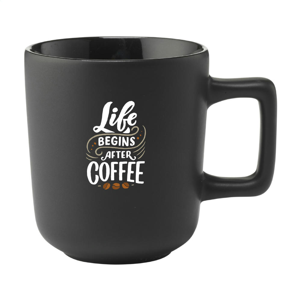 Becher aus hochwertiger Keramik mit einem auffälligen Henkel. Außen matt und innen hochglänzend lackiert. Spülmaschinenfest. Der Druck ist spülmaschinengeprüft und zertifiziert: EN 12875-2. Fassungsvermögen 280 ml. NOTIZ: Der weiße Becher kann nicht mit einer Lasergravur versehen werden, da diese nicht ausreichend sichtbar ist.