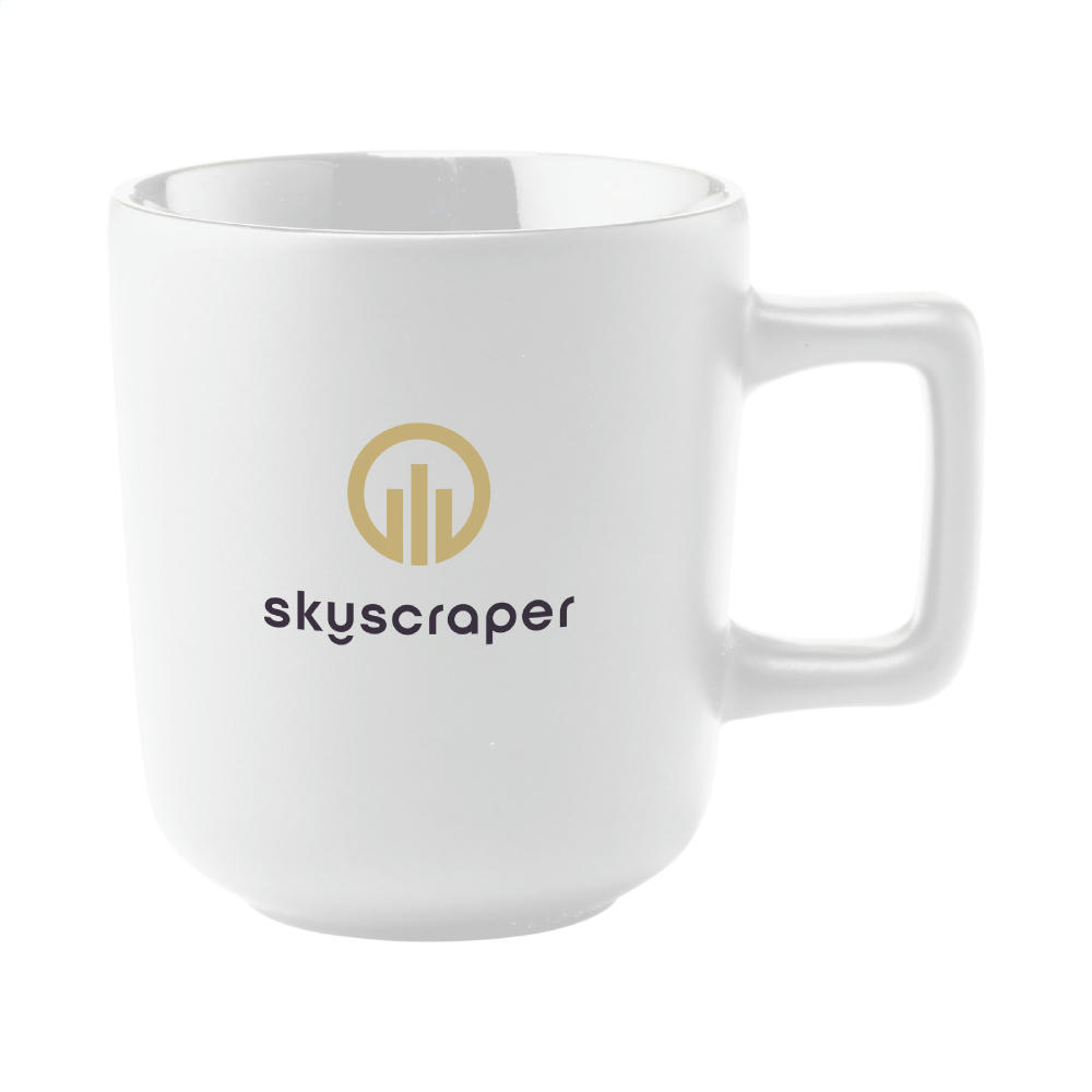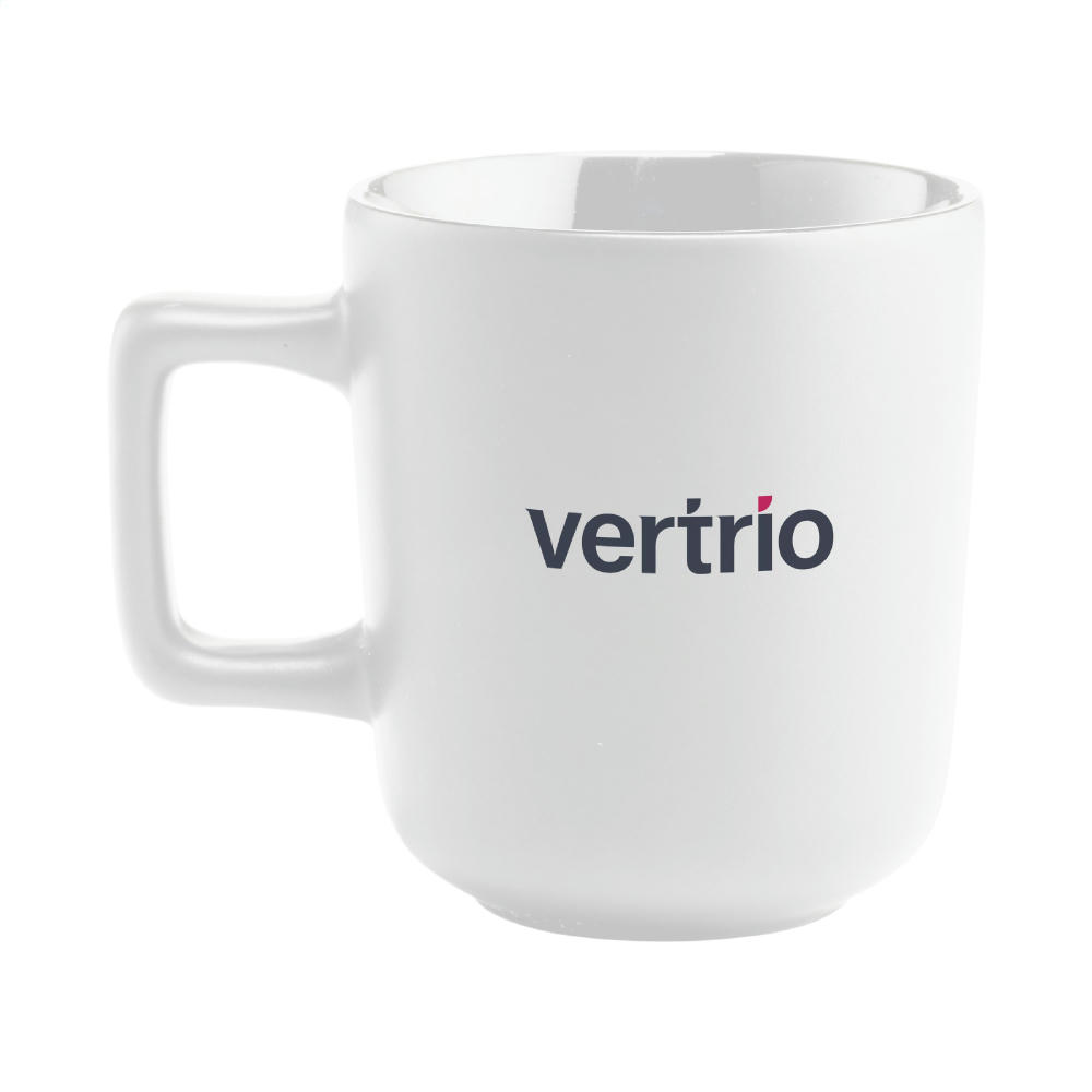 Becher aus hochwertiger Keramik mit einem auffälligen Henkel. Außen matt und innen hochglänzend lackiert. Spülmaschinenfest. Der Druck ist spülmaschinengeprüft und zertifiziert: EN 12875-2. Fassungsvermögen 280 ml. NOTIZ: Der weiße Becher kann nicht mit einer Lasergravur versehen werden, da diese nicht ausreichend sichtbar ist.