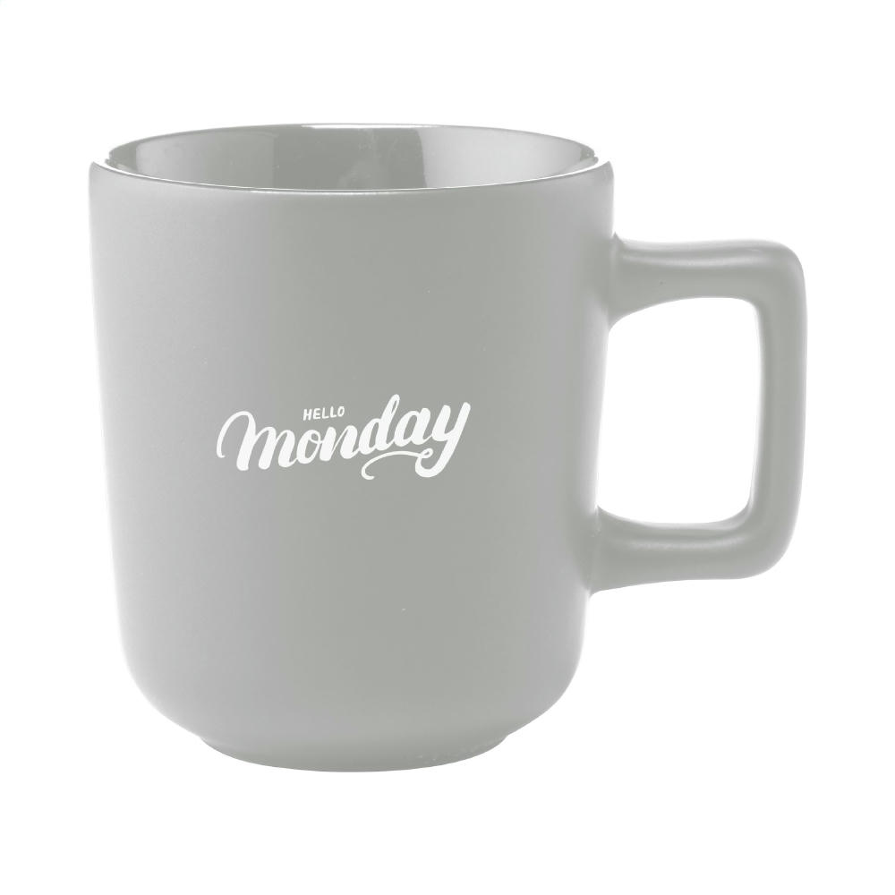 Becher aus hochwertiger Keramik mit einem auffälligen Henkel. Außen matt und innen hochglänzend lackiert. Spülmaschinenfest. Der Druck ist spülmaschinengeprüft und zertifiziert: EN 12875-2. Fassungsvermögen 280 ml. NOTIZ: Der weiße Becher kann nicht mit einer Lasergravur versehen werden, da diese nicht ausreichend sichtbar ist.