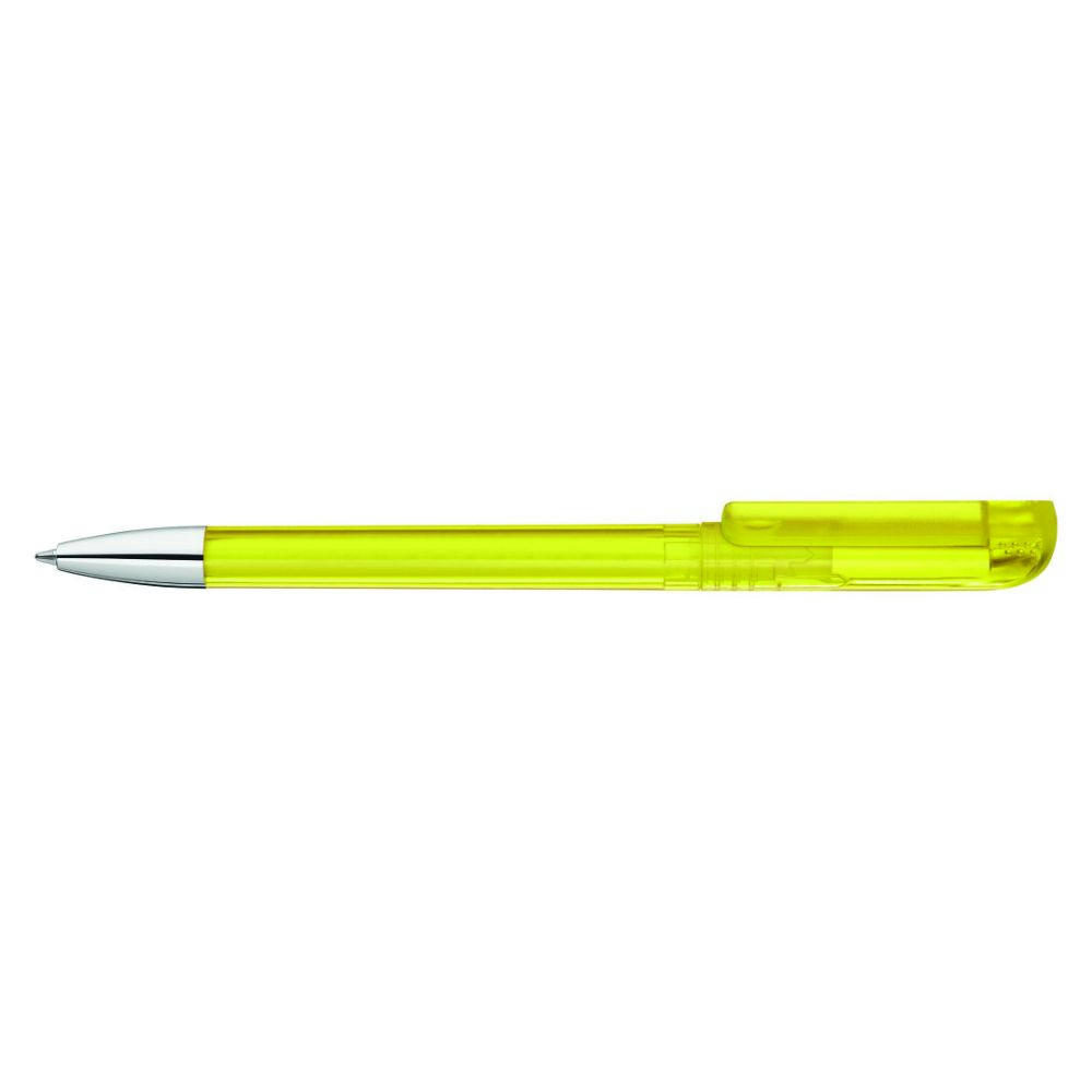Drehkugelschreiber mit transparent glänzendem Gehäuse, gefrosteter Clipoberfläche und Spitze glanzverchromt.