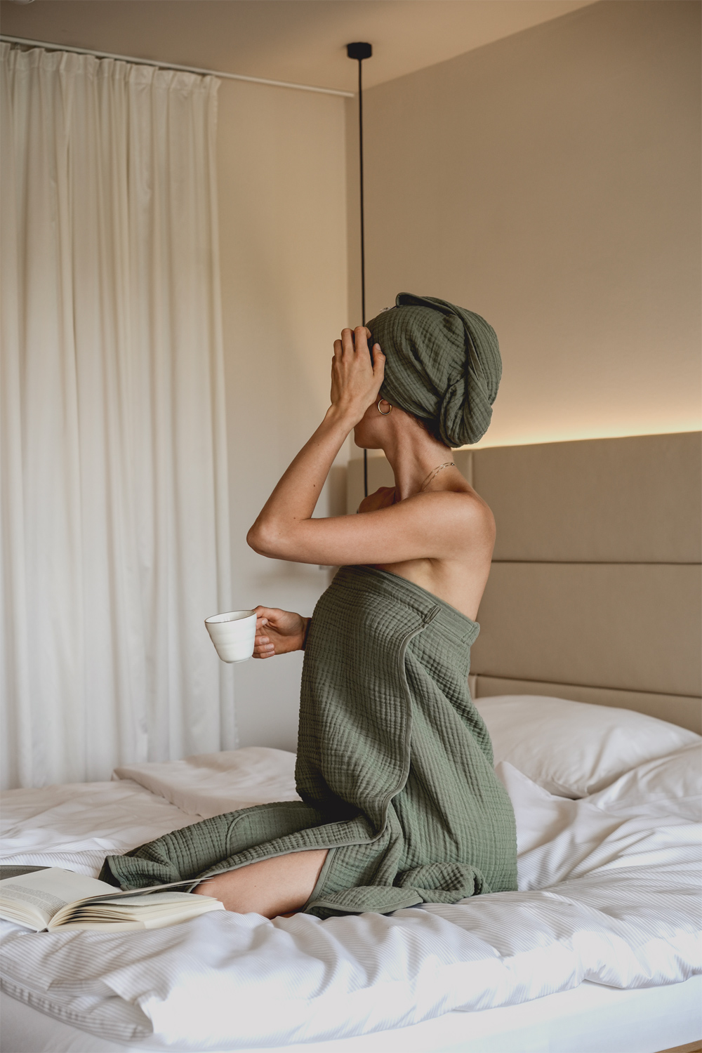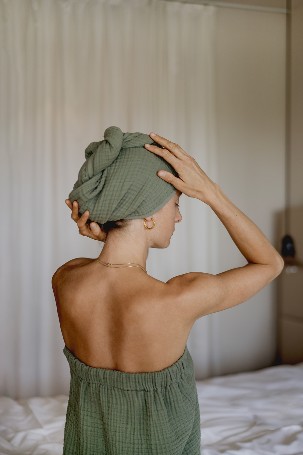 Turban und Spa Dress. Der Musselin Turban besticht durch hochwertige Baumwolle, die super saugfähig und besonders sanft zu den Haaren ist. Dank eines Knopf-Verschlusses ist er besonders leicht zu befestigen und passt sich jeder Kopfform perfekt an. Das Musselin Spa Dress aus hochwertiger Baumwolle zeichnet sich durch ein luftig leichtes Tragegefühl aus. Dank der flexiblen Druckknöpfe passt es sich jeder Figur an und besitzt eine praktische Tasche für Handy oder sonstige Accessoires.