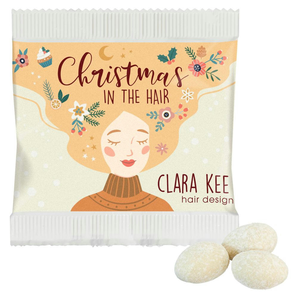 3 feine Mandeln dragiert mit 74 % weißer Schokolade mit Vanillegeschmack, umhüllt mit Puderzucker, in weißem Papierwerbetütchen verpackt. Haltbarkeit: ca. 3 Monate.