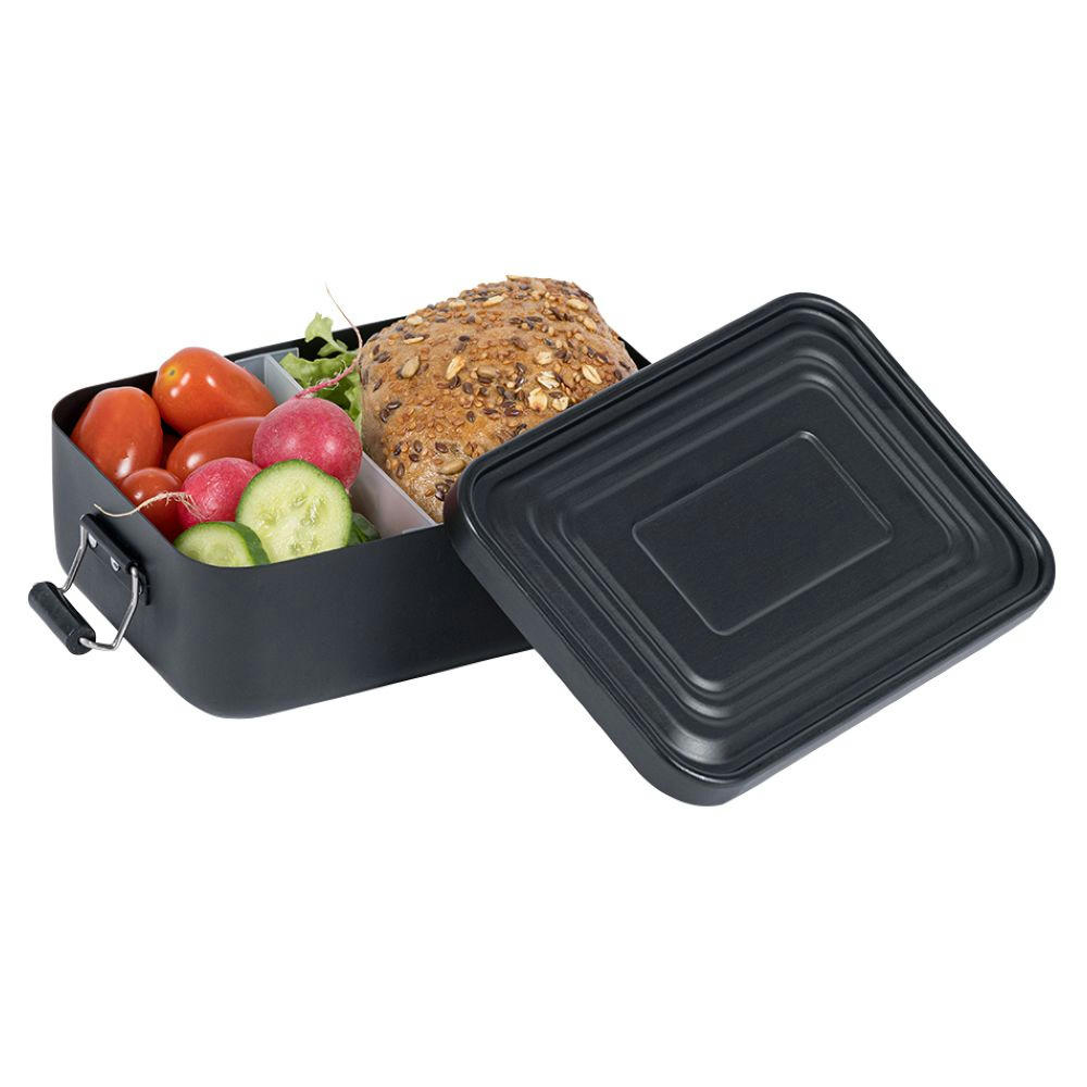 Lunchbox aus Aluminum mit zwei Klemmbügel für sicheres Verschließen. Deckel komplett abnehmbar mit Silikondichtung. Volumen: ca. 1.100 ml; Maße: 17,9 x 11,6 x 5,5 cm