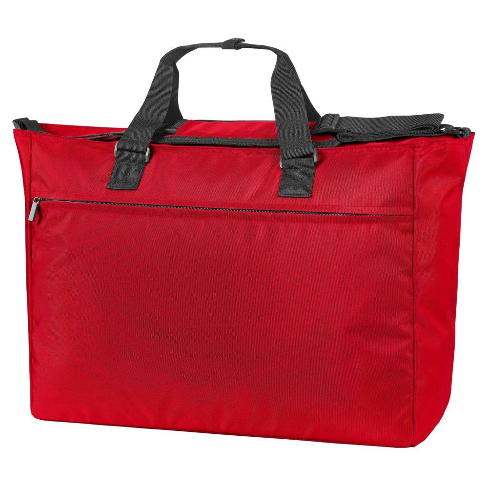 moderner, leicht gepolsterter Weekender; rPET-Obermaterial; großes Hauptfach mit 2-Wege-Reißverschluss; Reißverschluss-Vortasche; flaches Reißverschlussfach innen; beidseitig längenverstellbarer Tragegurt mit genähtem Schulterpolster; Handgriffe mit Druckknopfmanschette