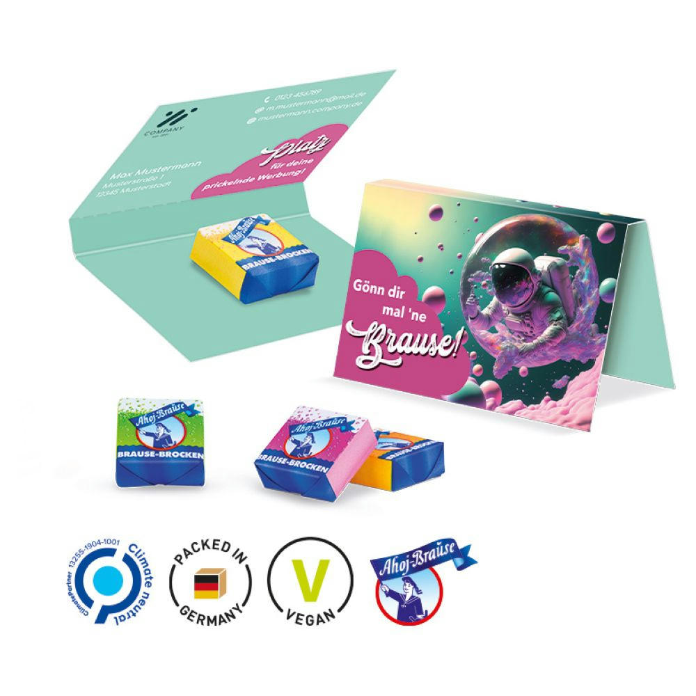 Aufklappbare Werbekarte im Visitenkartenformat, weißer Karton, mit praktischer Abreißperforation, individuell bedruckt. Inhalt: Ahoj-Brause Brocken, vegan, 8 g, Verkauf und Lieferung nur in Deutschland, Österreich und Schweiz.