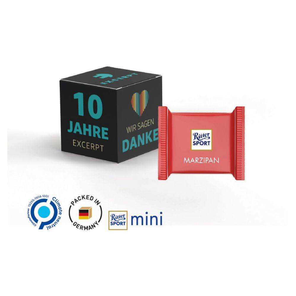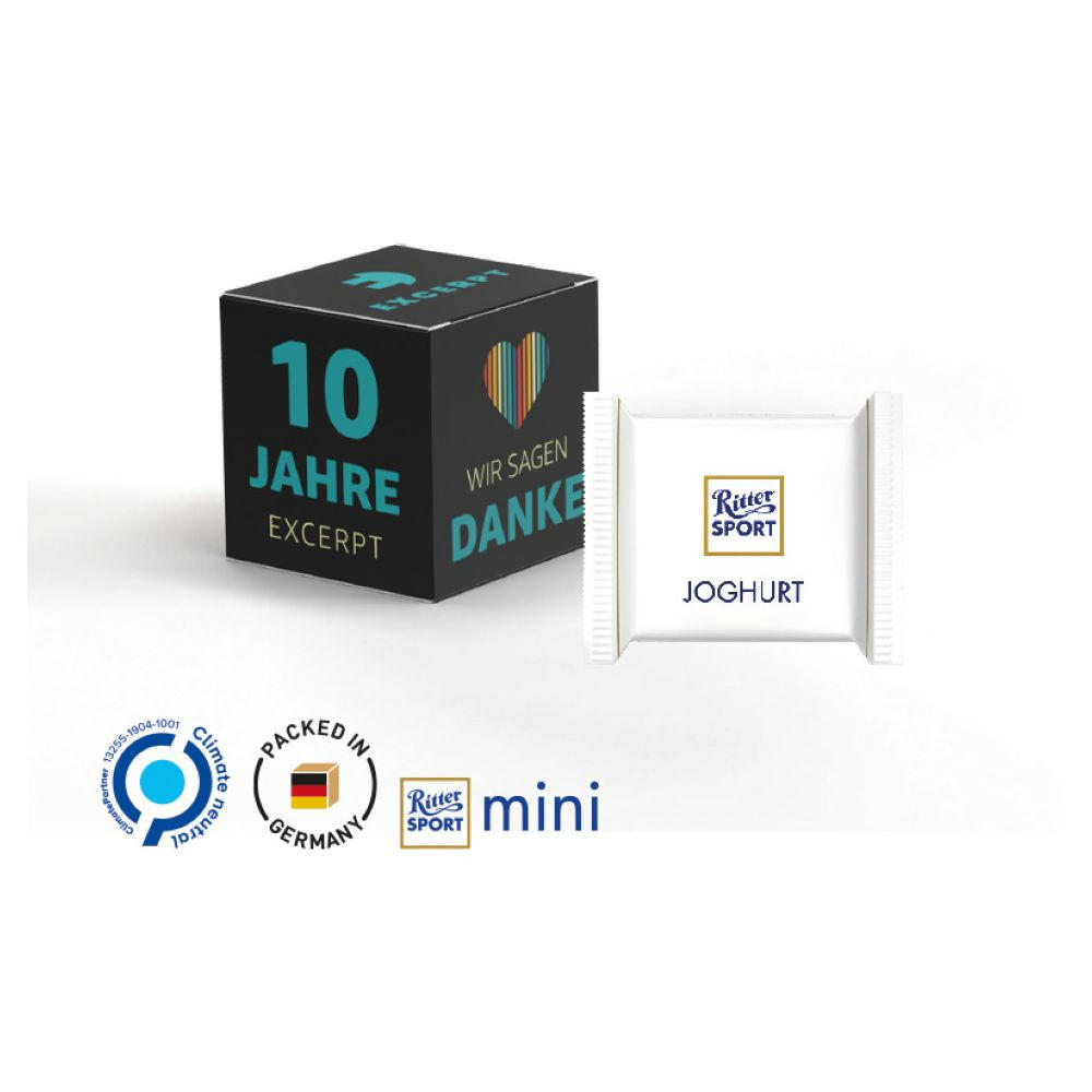 Würfelförmige Werbeverpackung aus weißem Karton, individuell bedruckt. Inhalt: Ritter SPORT Mini Schokolade, Edelvollmilch (nur sortenrein), 66 g