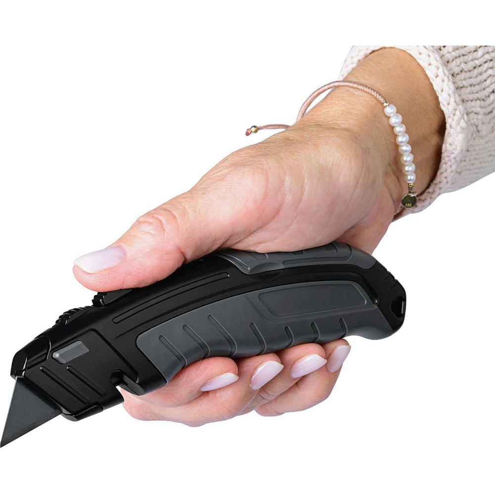 Universal-Trapezklingenmesser mit SK2 Hochleistungsklingen. Hochwertiges Qualitäts-Cuttermesser mit Aluminiumgehäuse und 3-fach arretierbarem Klingenausschub. Für Rechts- und Linkshänder geeignet.