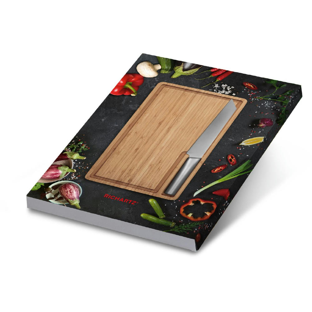 Das Küchenset kombiniert das hochwertige RICHARTZ Chefmesser mit einem Schneidbrett aus Holz. Zur Aufbewahrung findet das Chefmesser in der Griffmulde des Schneidbretts seinen Platz in welcher es magnetisch gehalten wird. Indiv. 4-c bedruckte Verpackung und Lasergravur auf Messer möglich.