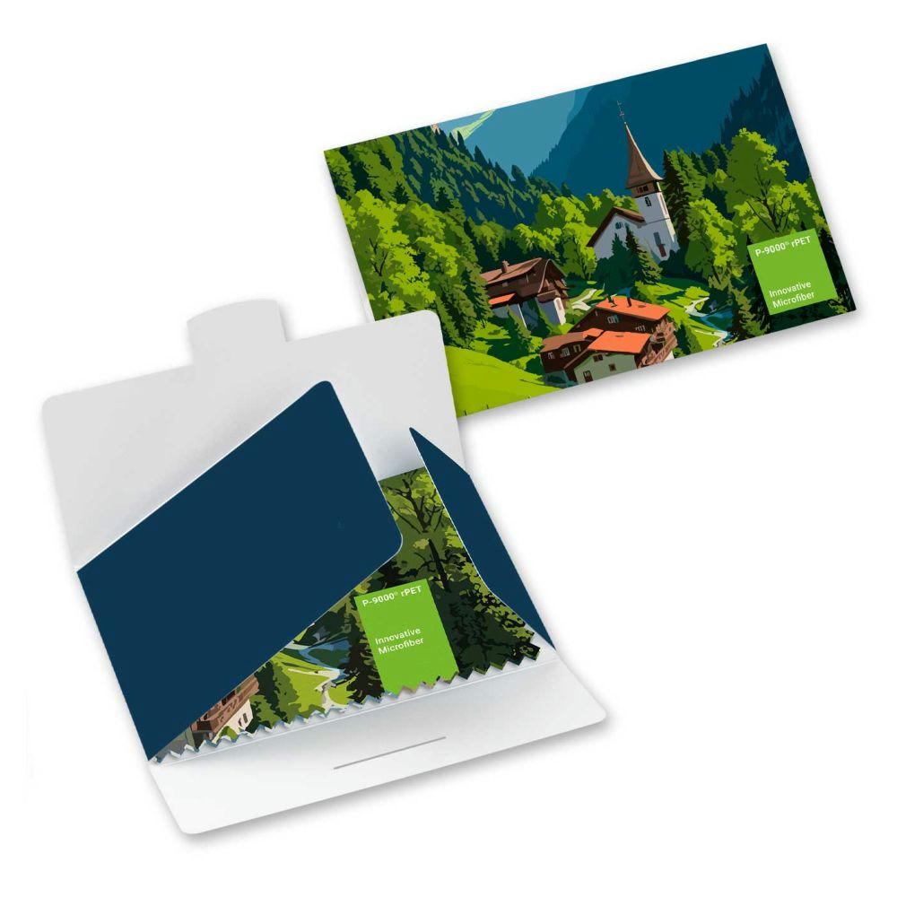 Microfasertuch aus rPET zur streifenfreien Reinigung von z.B. Brillen, Optiken, Displays, DVD‘s und empfindliche Oberflächen. Einzeln im bedruckbaren Papieretui verpackt. Preis inkl. 4/0 Druck sowie inkl. Druckvorlauf- und Versandkosten an eine Adresse in Deutschland auf dem Festland.